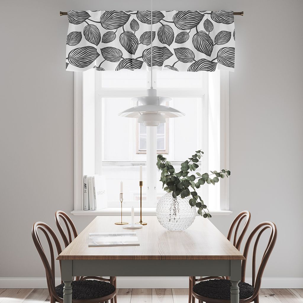 Gardinkappa på metervara med stora svarta blad på en vit botten