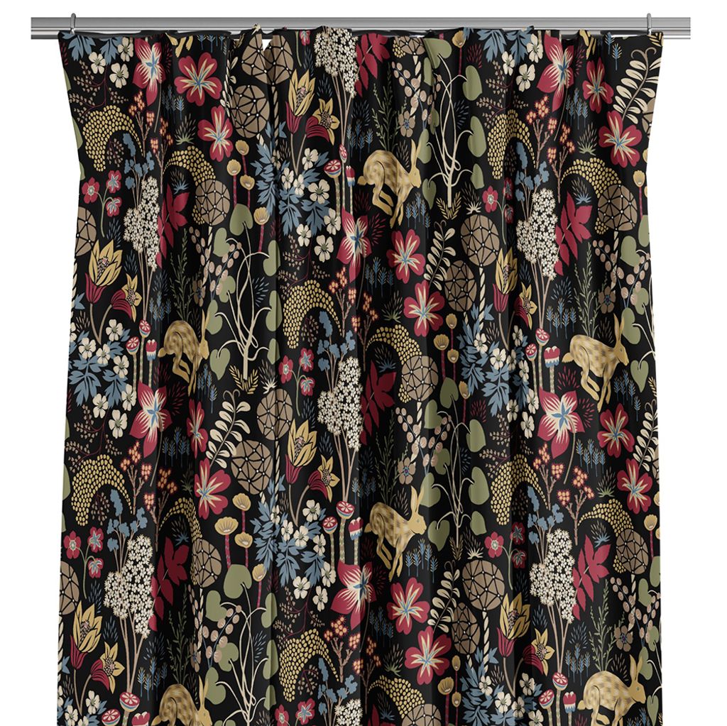 Gardiner med sagolikt mönster med växter, harar, blommor i härliga färger på en svart botten.