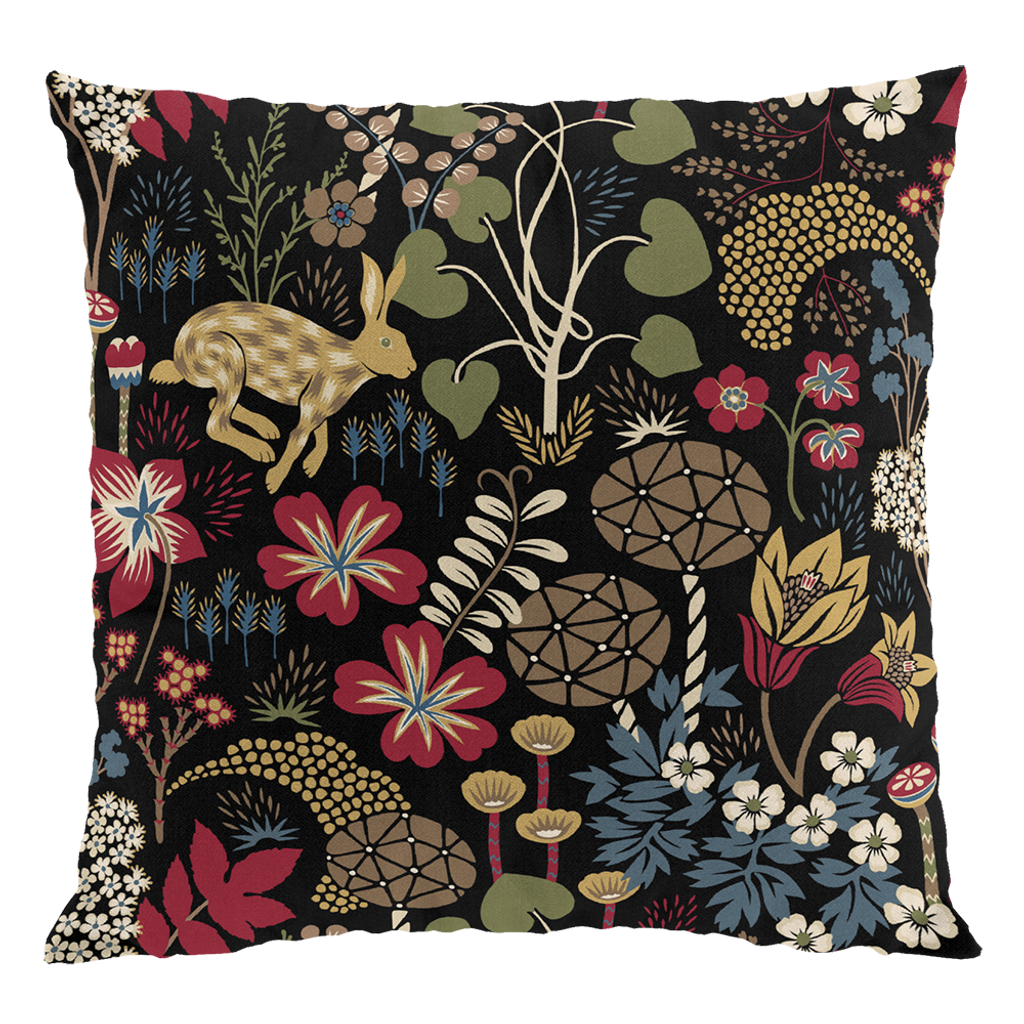 Ett kuddfodral med underbart mönster av växter, blommor, och en hare.
