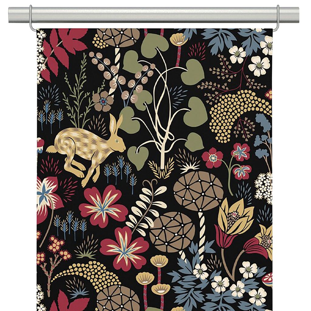 2-pack Lyckeflykt röd-brun panelgardiner med ett detaljerat mönster med blommor, blad och en hare. Designat av: Hanna Werning. Tilllverkat i Estland