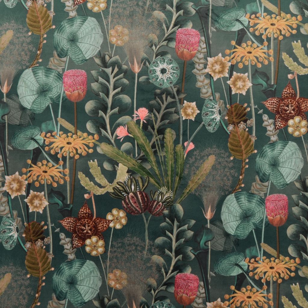 Sammetstyg med tungt och härligt fall, vackert blommigt mönster på grön petrol botten. Tyget är perfekt tull gardiner och kuddar.