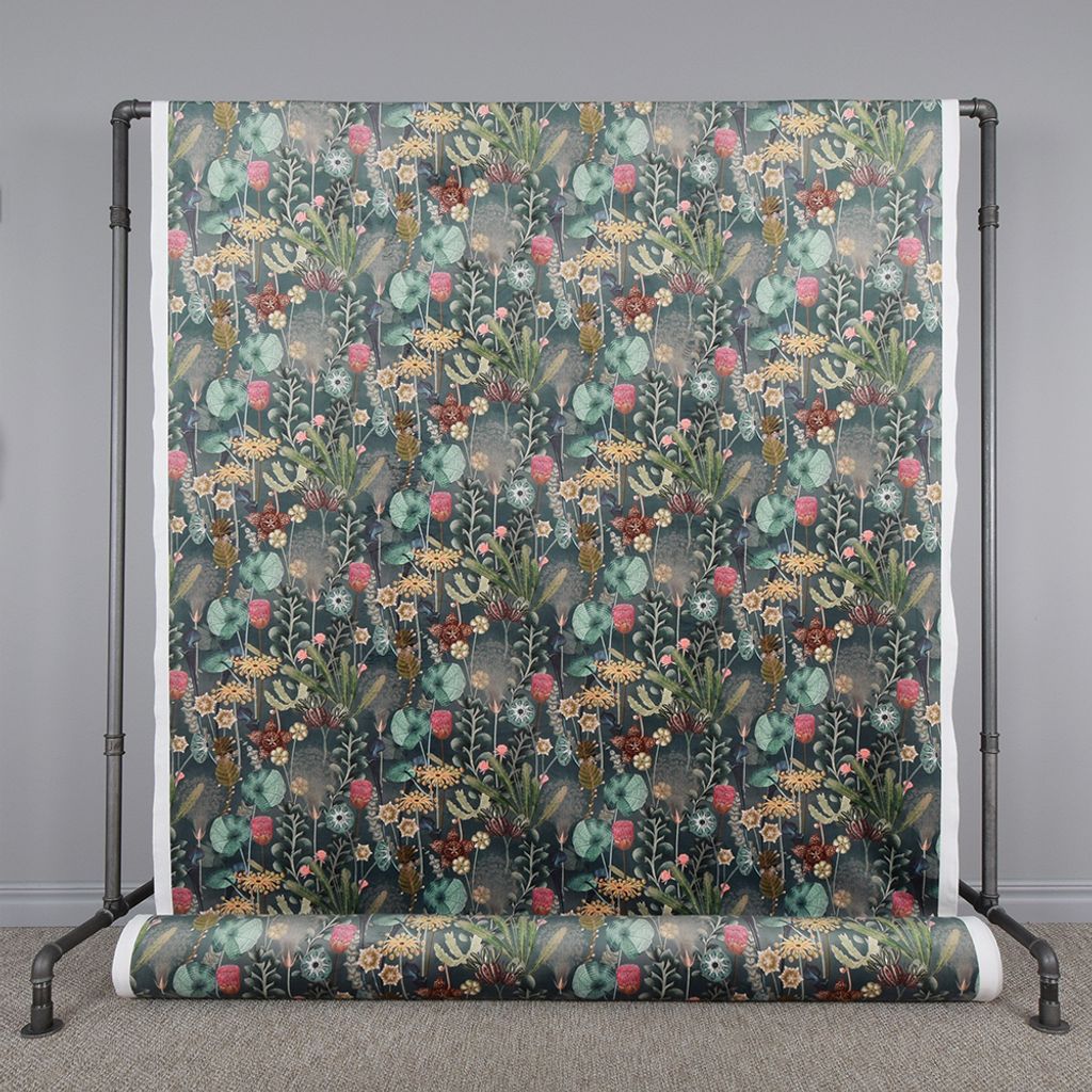 Sammetstyg på metervara för gardiner och inredning med härlig tyngd och och vackert blommigt mönster på petrol botten.