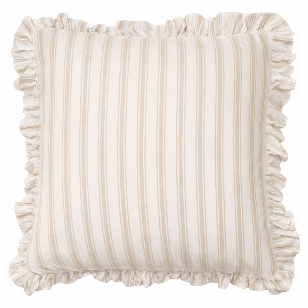 Madicken beige kuddfodral är ett randigt kuddfodral i enzymtvättad bomull med dekorativ volang runt om. Ett mjukt och charmigt tillskott som skapar en avslappnad och tidlös känsla i hemmet.