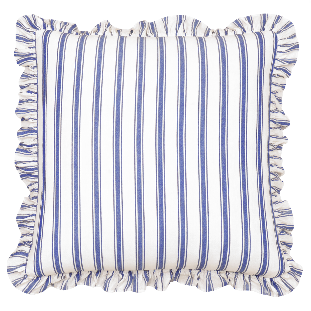Madicken blå kuddfodral är ett randigt kuddfodral i enzymtvättad bomull med dekorativ volang runt om. Ett mjukt och charmigt tillskott som skapar en avslappnad och tidlös känsla i hemmet.