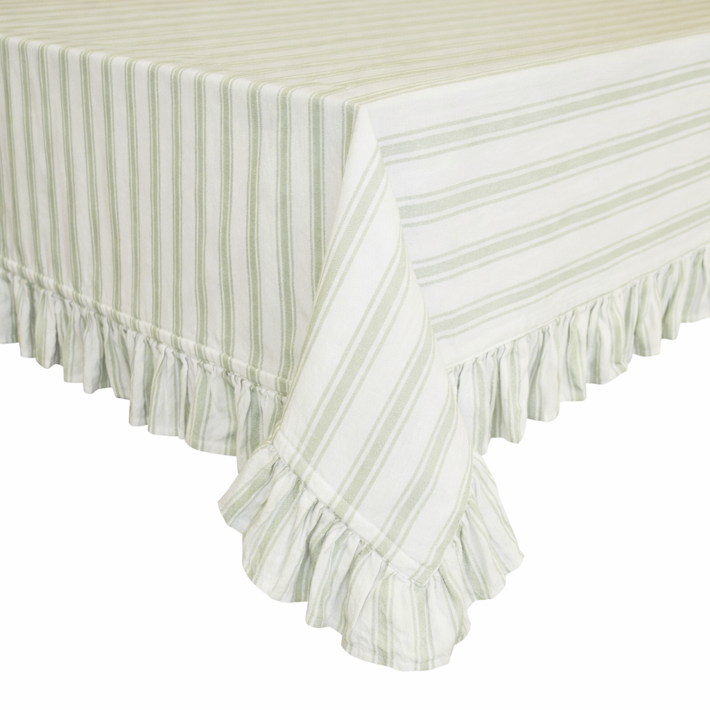 Madicken grön är en charmig bordsduk med klassiska blå ränder och romantisk volangkant, som ger ett tidlöst och lantligt uttryck till ditt dukade bord. Duken är tillverkad i enzymtvättad bomull.