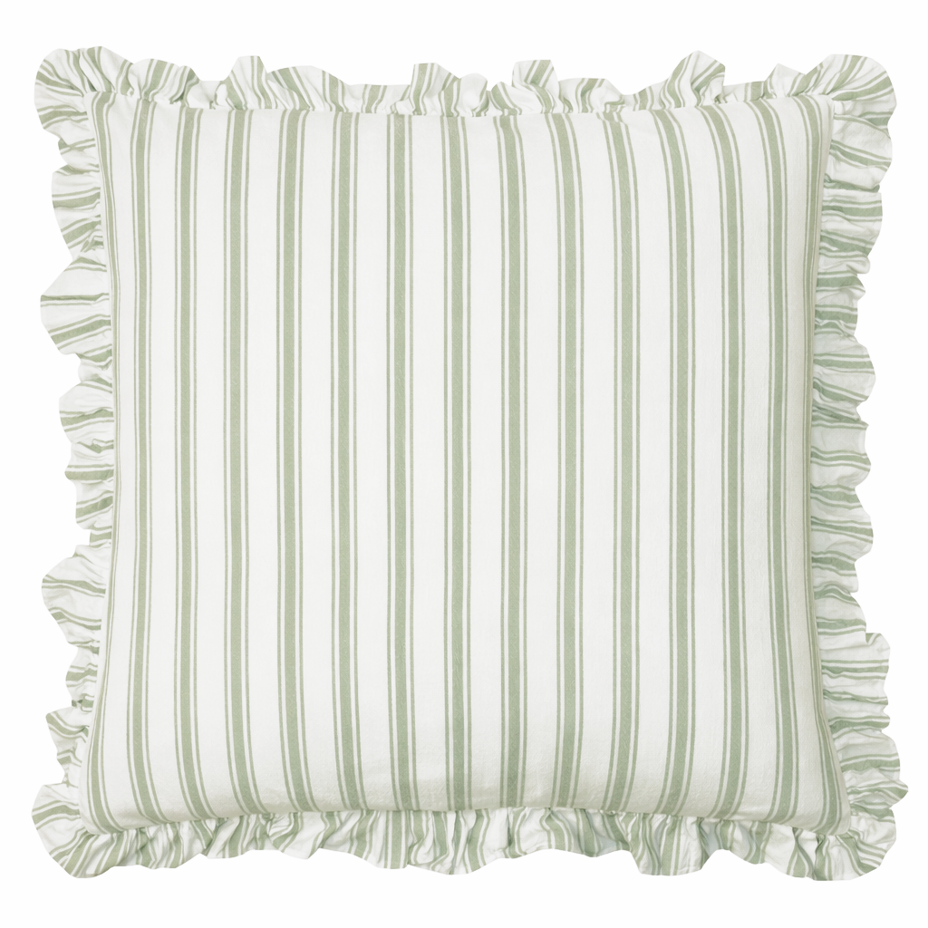 Madicken grön kuddfodral är ett randigt kuddfodral i enzymtvättad bomull med dekorativ volang runt om. Ett mjukt och charmigt tillskott som skapar en avslappnad och tidlös känsla i hemmet.