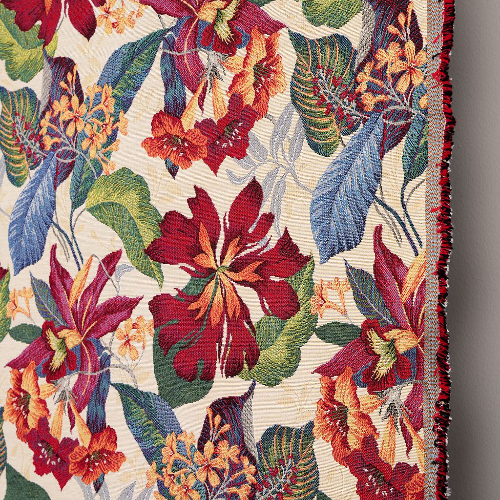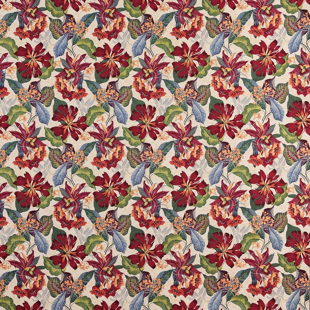Marcela beige gobeläng är ett elegant jacquardvävt möbeltyg med stora, exotiska blommor i varma röda och orange toner mot en mjuk beige botten. Ett uttrycksfullt tyg som kombinerar tropisk känsla med klassisk vävstruktur.