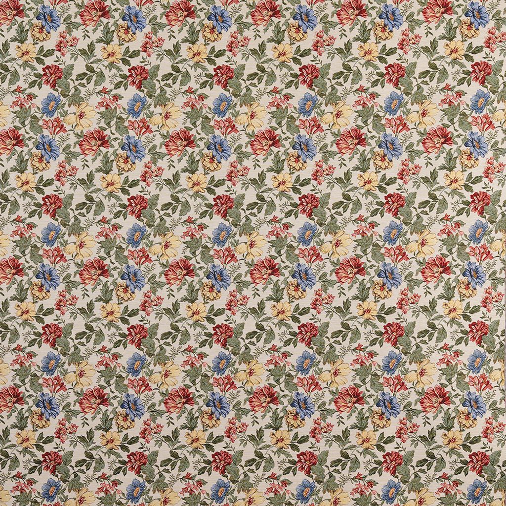 Marujita beige gobeläng är ett elegant och uttrycksfullt möbeltyg som kombinerar klassisk gobelängväv med ett livfullt blommotiv. Mönstret består av stora tropiska blommor och blad i djupa röda, blå och gröna toner som skapar en varm och ombonad känsla mot den ljusa beige bakgrunden.