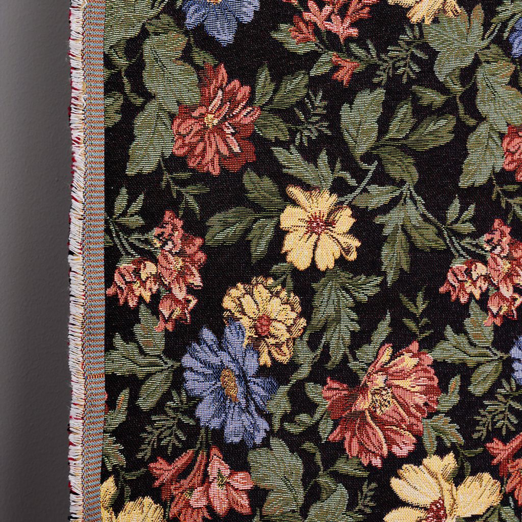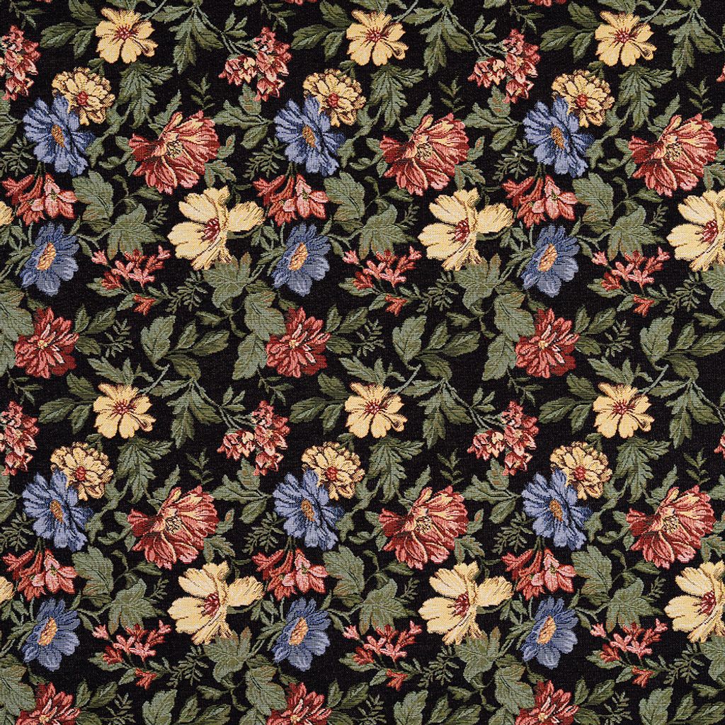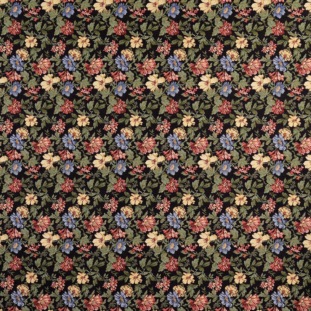 Marujita svart är en elegant gobeläng med ett klassiskt blommönster mot djup svart botten. De mjuka nyanserna av rött, blått, gult och grönt skapar en levande kontrast och ger tyget en sofistikerad och tidlös karaktär – perfekt för möbelomklädsel och inredningsdetaljer.