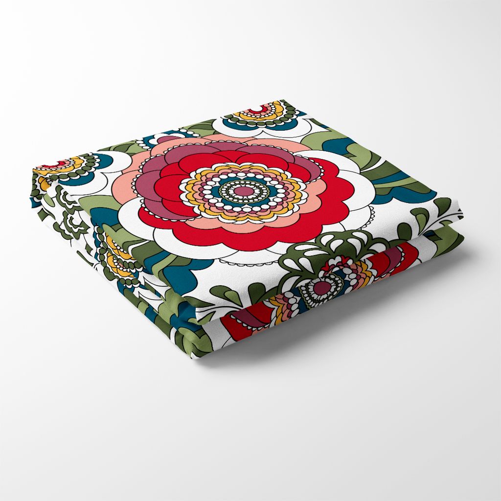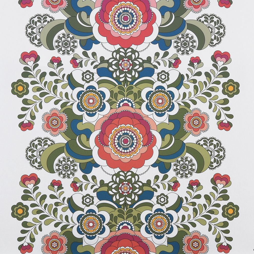 Stor duk med ett stort vackert kurbits mönster som vi tagit fram i samarbete med Sari Ahokainen och Shalmiak färgerna, grönt, rött och rosa.