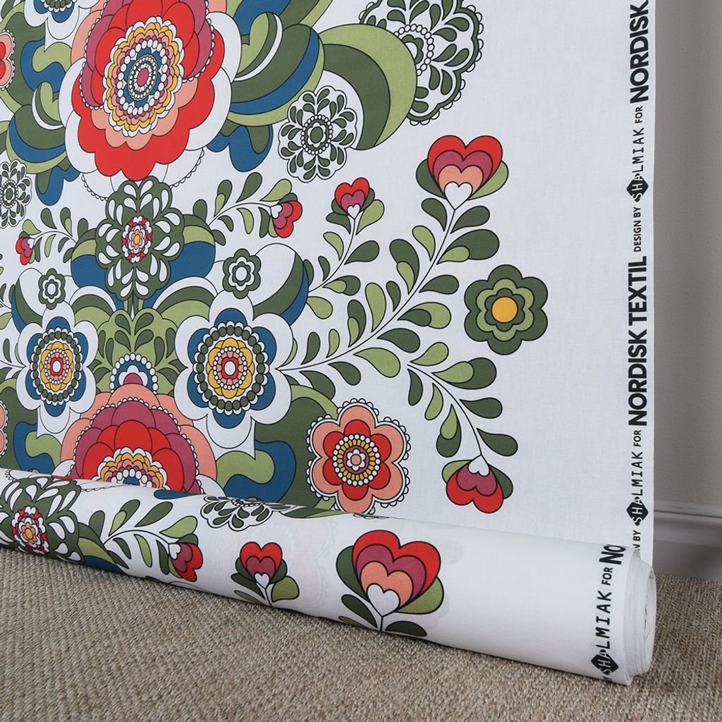 Vi har tillsammans med Shalmiak tagit fram och tryckt detta underbara kurbits liknande mönster. Mönster går över hela tyget och har en färgställning i grönt, rött, rosa.