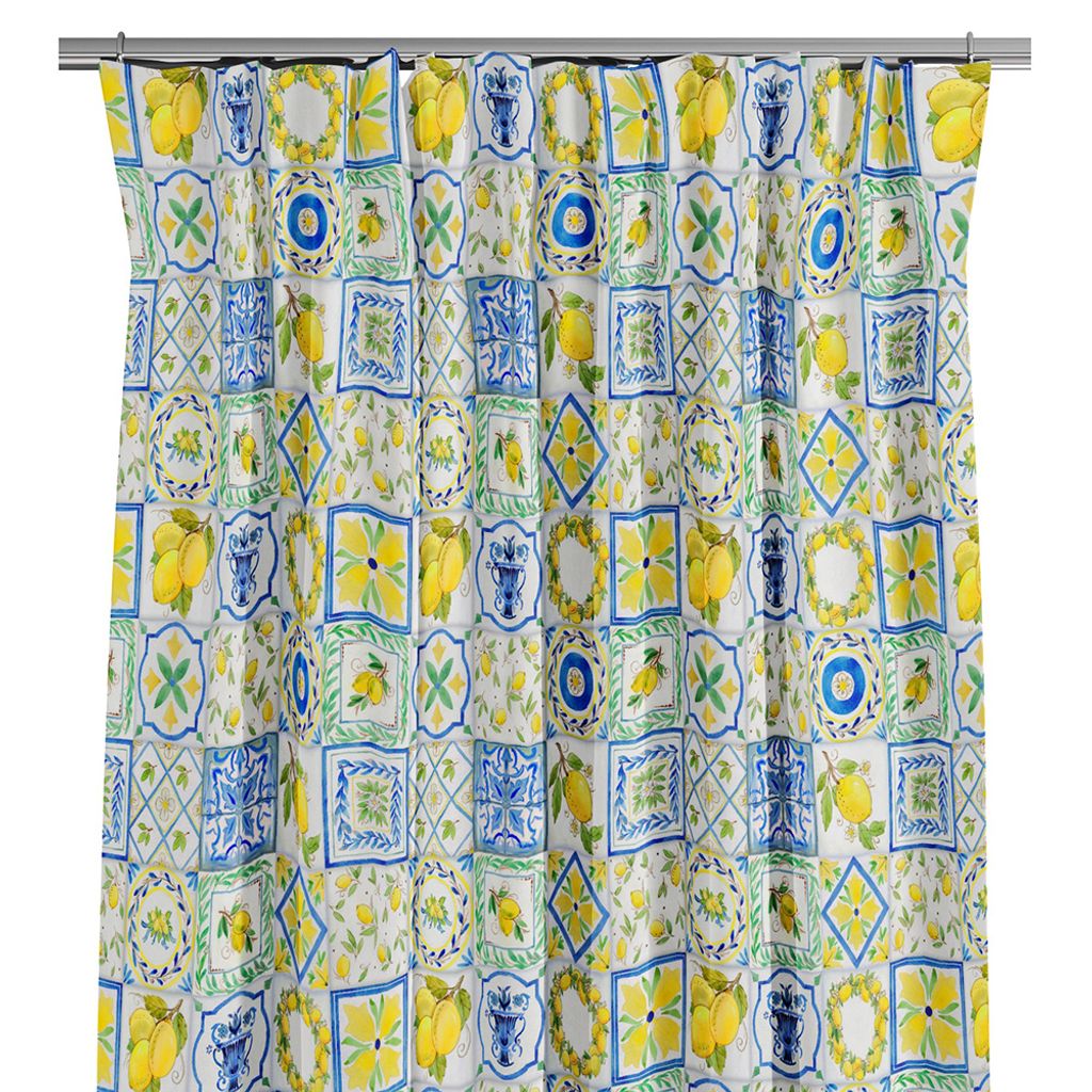 Mediterranean Mosaic gardiner förmedlar en känsla av soliga kustlandskap med sitt detaljrika mosaikmönster i blått, gult och grönt. Inspirerade av traditionella medelhavsplattor blir de ett elegant och färgstarkt tillskott till ditt hem. Ouppfållade med overlocksöm nedtill.