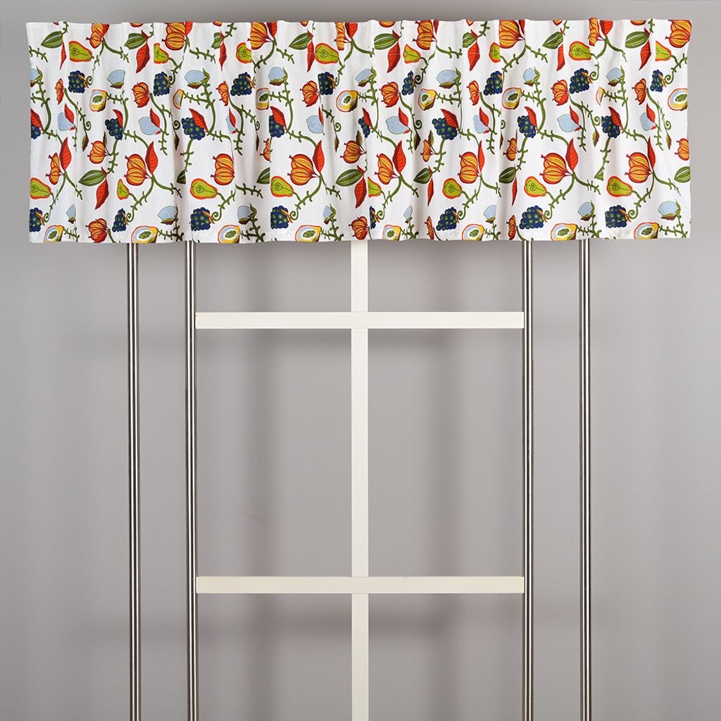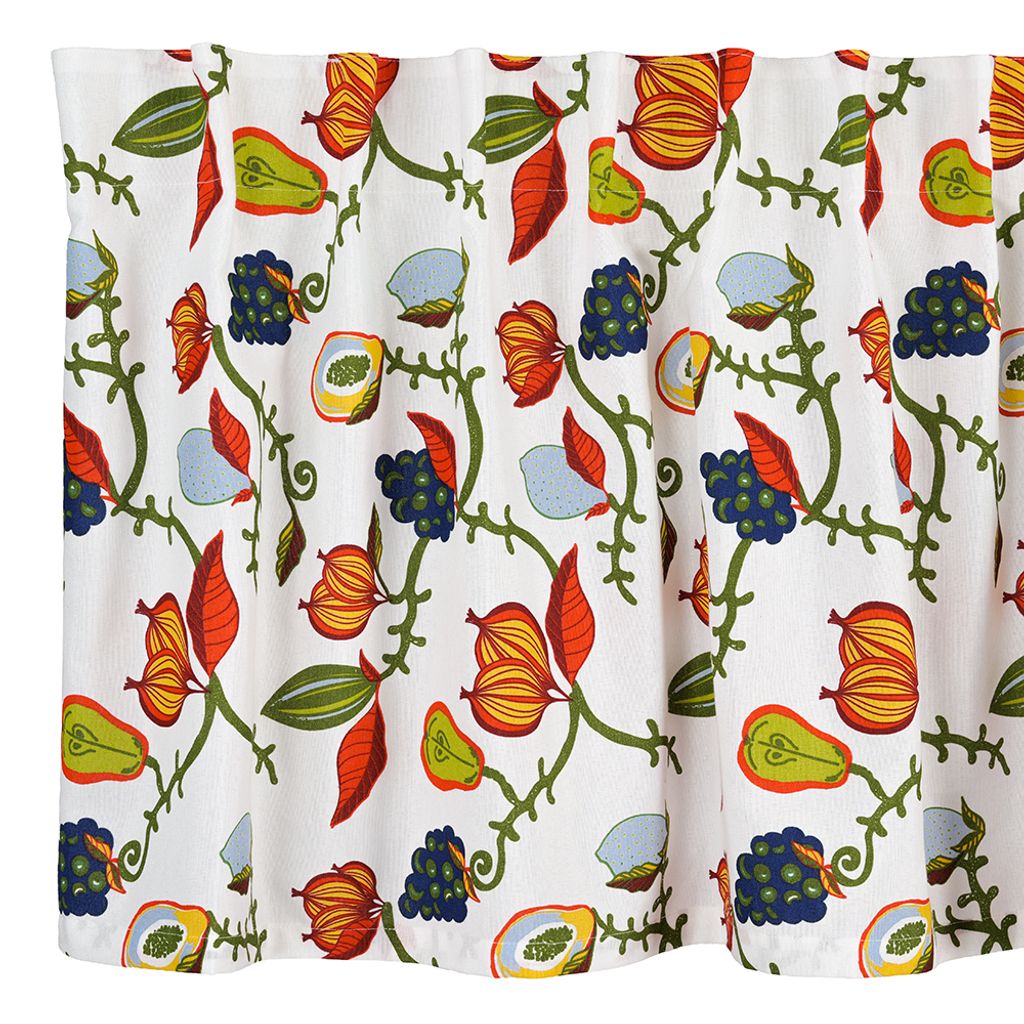 Melora röd gardinkappa är en livfull och färgstark fönsterdekoration med slingrande rankor, frökapslar och bär i klara nyanser. En lekfull detalj som ger rummet en varm och hemtrevlig känsla.