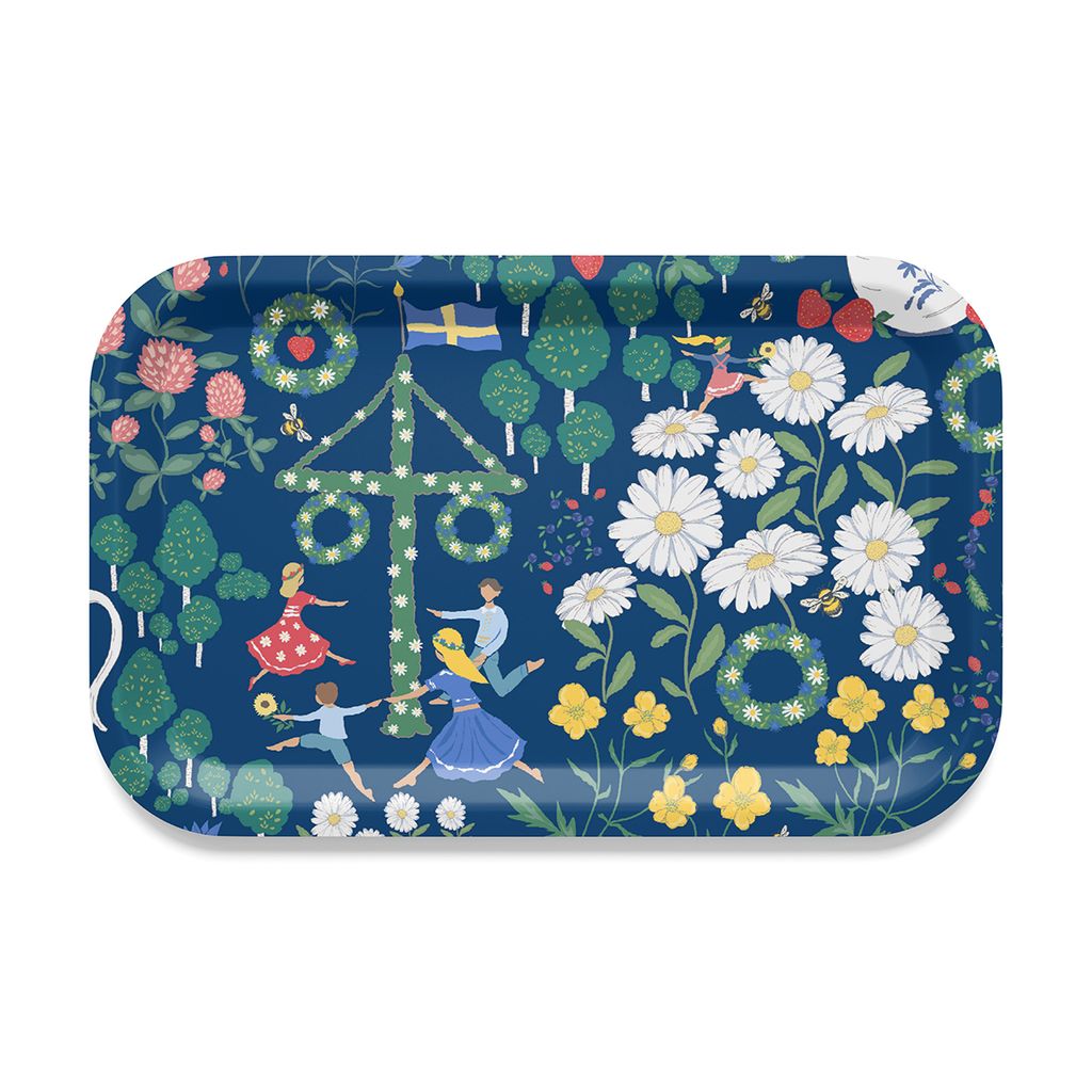 Midsommardans blå bricka fångar den svenska sommarens glädje och traditioner i ett detaljrikt och levande motiv. Här syns dans runt midsommarstången, blomsterkransar, smultron, prästkragar och grönskande björkar som tillsammans skapar ett stämningsfullt blomstermönster mot en djupblå bakgrund.