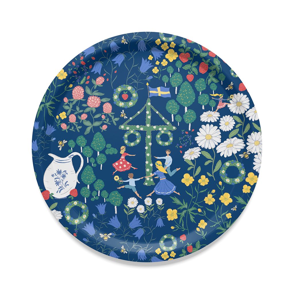 Midsommardans blå rund bricka fångar känslan av svensk sommar när den är som allra vackrast. Motivet visar dans runt midsommarstången, blomsterkransar, smultron, prästkragar och grönskande björkar – allt mot en djupblå bakgrund som lyfter färgerna och ger brickan ett levande men harmoniskt uttryck.