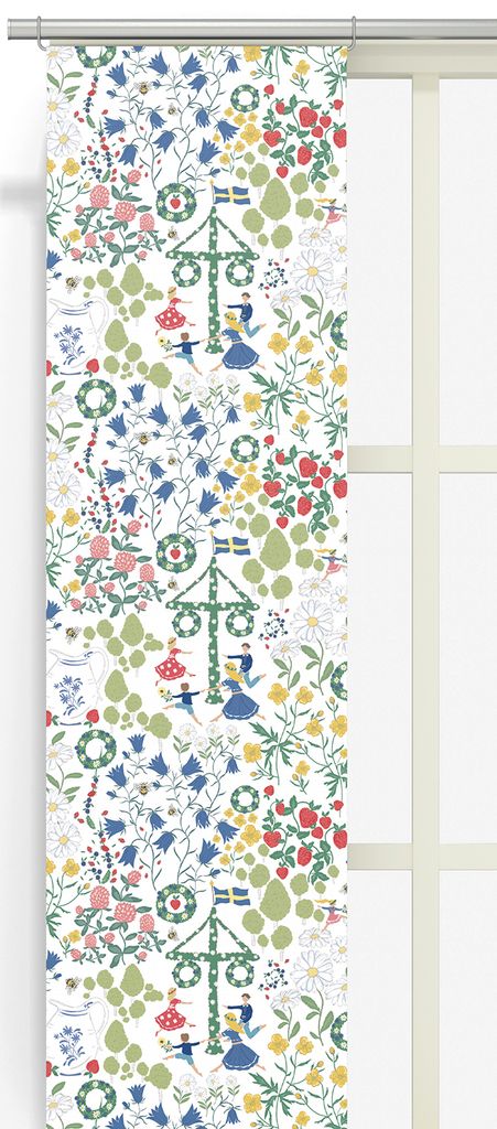 Midsommardans vit panelgardiner fångar essensen av svensk sommar i ett rikt och berättande mönster. Mot en vit botten breder ett levande blomstermönster ut sig med prästkragar, smultron, klöver, klockblommor och surrande bin. I mönstret syns barn som dansar runt midsommarstången, blomsterkransar, gröna björkar och den svenska flaggan – detaljer som tillsammans skapar en varm och lekfull helhet.