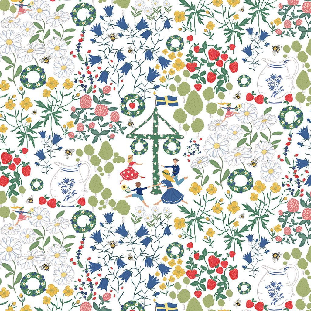 Midsommar vit kuddfodral fångar känslan av svensk sommar med lekfulla motiv av blommor, jordgubbar och dans kring midsommarstången.
