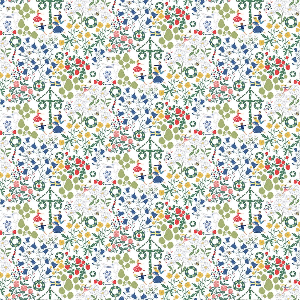 Midsommardans vit tyg fångar känslan av ljusa sommardagar och klassiska midsommartraditioner. Mönstret är fyllt av igenkännbara detaljer som midsommarstång, blomsterkransar, prästkragar, blåklockor, smultron och dansande figurer i rörelse. De mjuka gröna, blå, gula och röda tonerna skapar ett livfullt men balanserat helhetsintryck mot den ljusa botten.