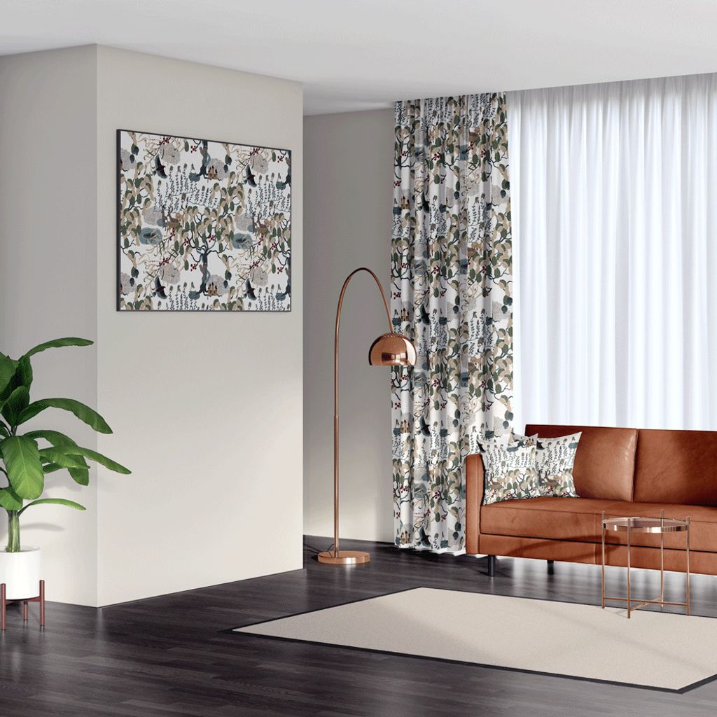Mimers källa turkos gardiner har dämpade gröna, beige och blå nyanser och ett mönstret som tar dig till en scen full av liv med hjortar som samlas vid en stilla källa, omgivna av lummiga träd och slingrande grenar.