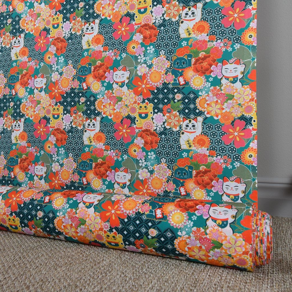 Beskrivning av Miyuki bomullstyg med lyckokatter och blomster