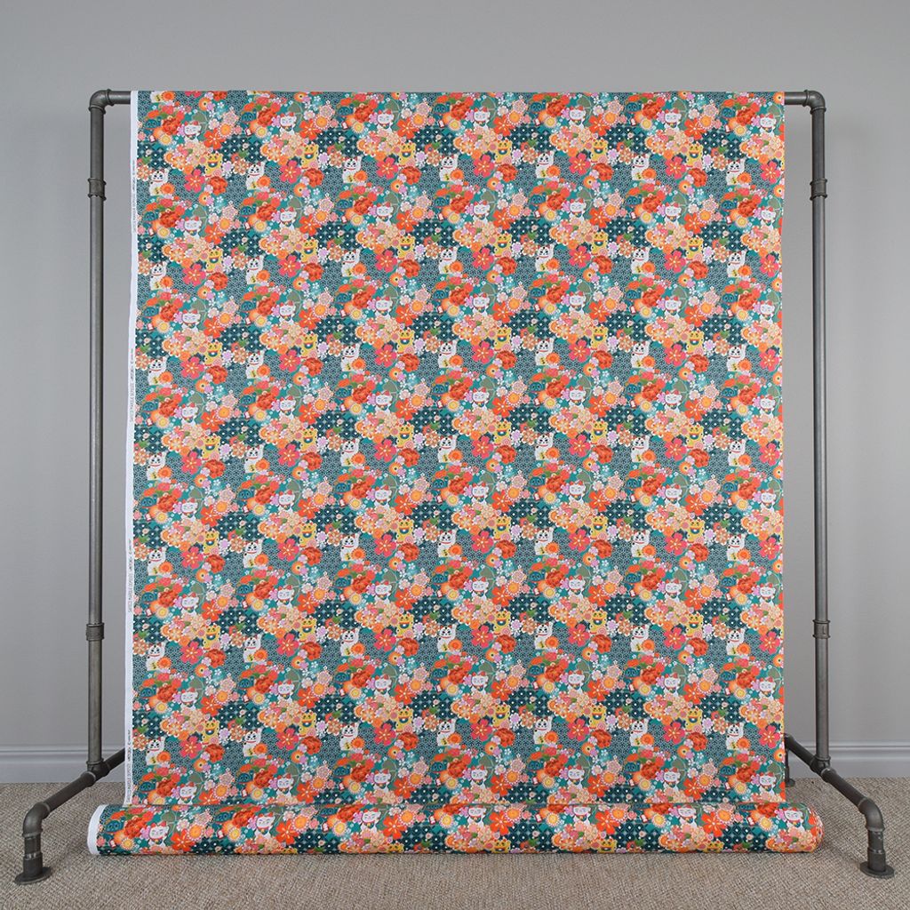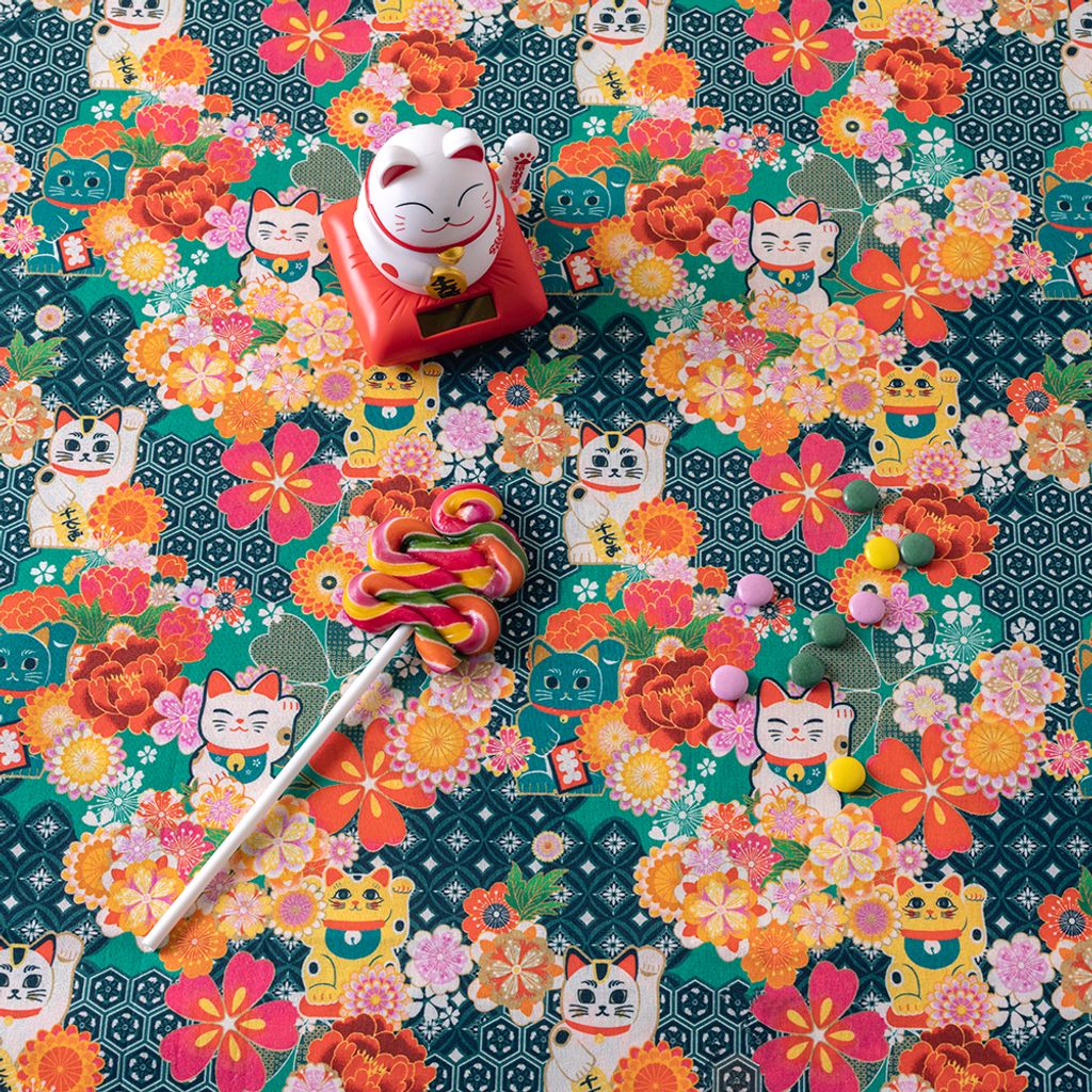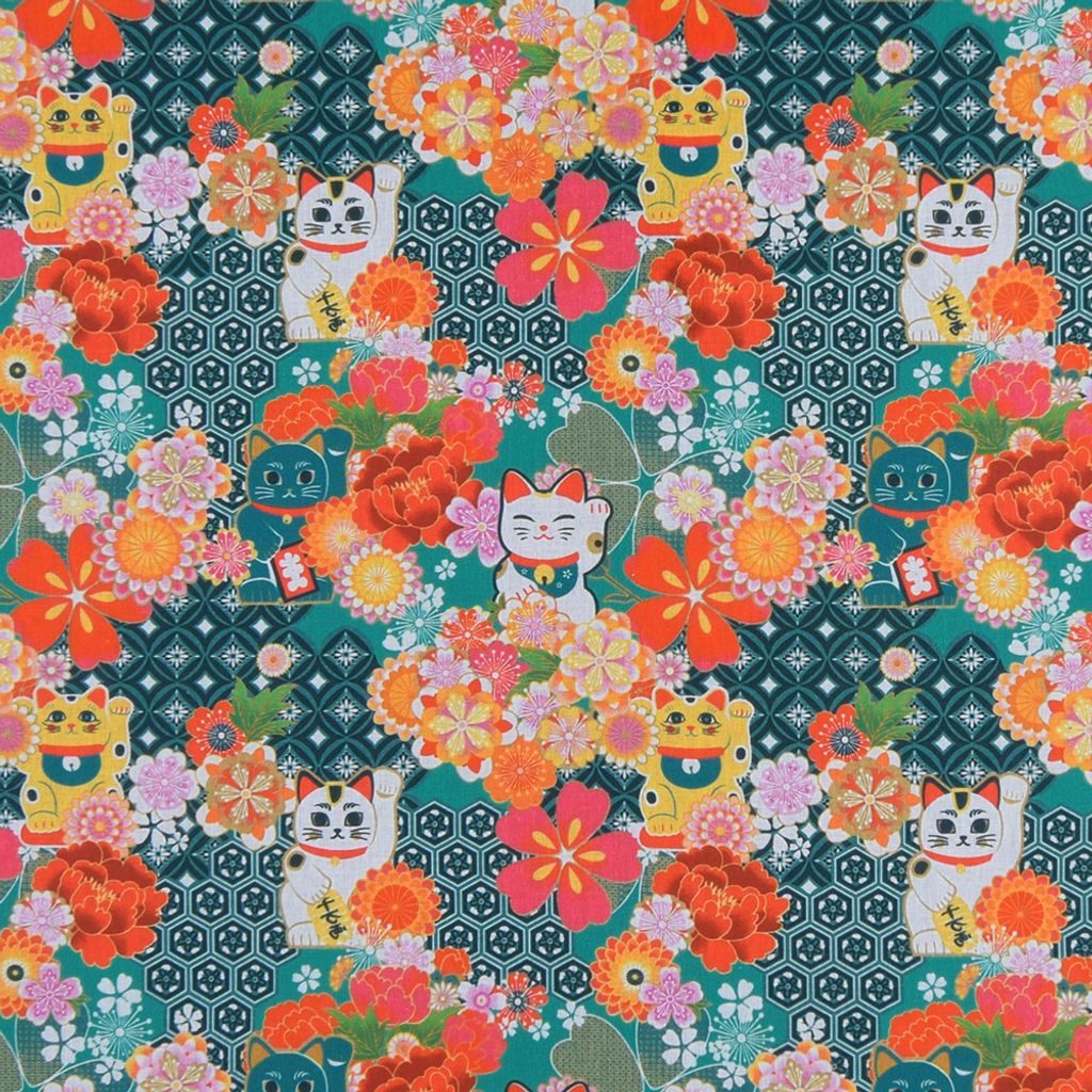 Miyuki tyg - 100% bomullstyg i bredd 150cm med ett härligt färgsprakande mönster av blommor och lycko katter.