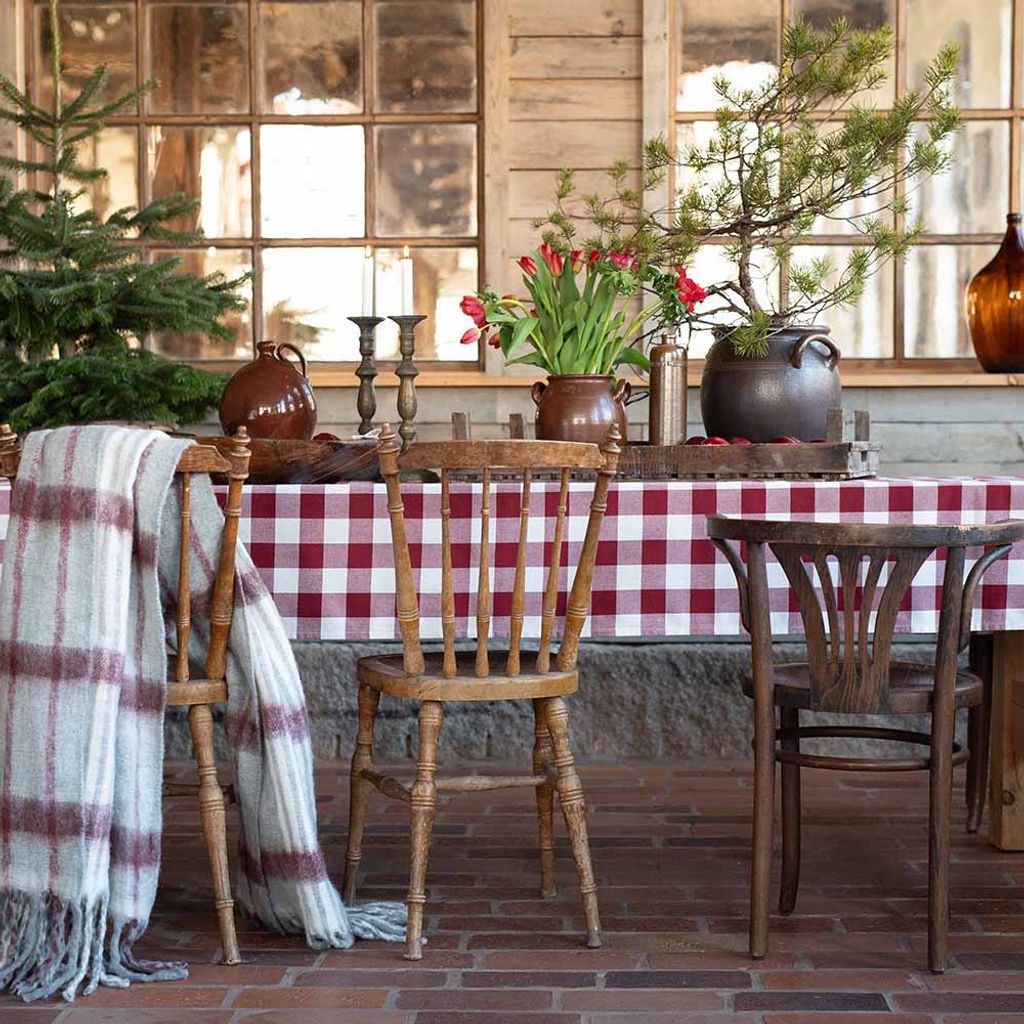 Moa Röd duk är en vacker och mångsidig bordduk som kombinerar klassisk design med en varm och inbjudande färgskala. Det rutiga mönstret med 4,5 cm stora rutor i rött och vitt ger en balanserad och harmonisk känsla, samtidigt som den diskreta designen gör att duken blir en naturlig del av varje dukning.