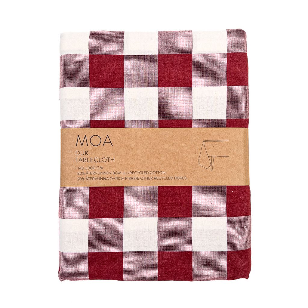Moa Röd duk är en klassisk rutig duk i röda och vita toner. Den tidlösa designen med 4,5 cm rutor skapar en harmonisk och hemtrevlig känsla för både vardag och fest.