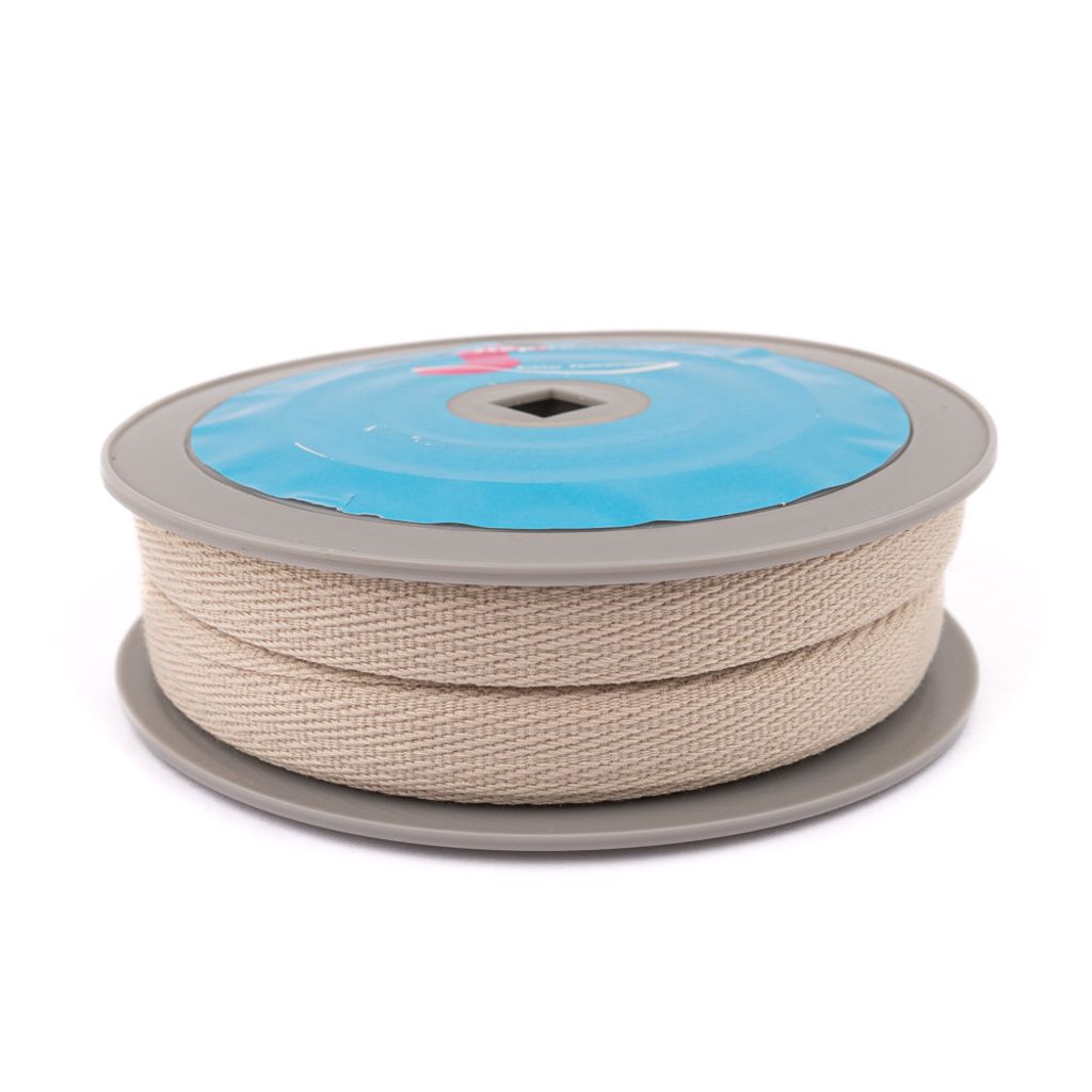 Slätt creme färgat möbelband i 100% polyester, 15mm bred, metervara för tapetsering med känsla av bomull.