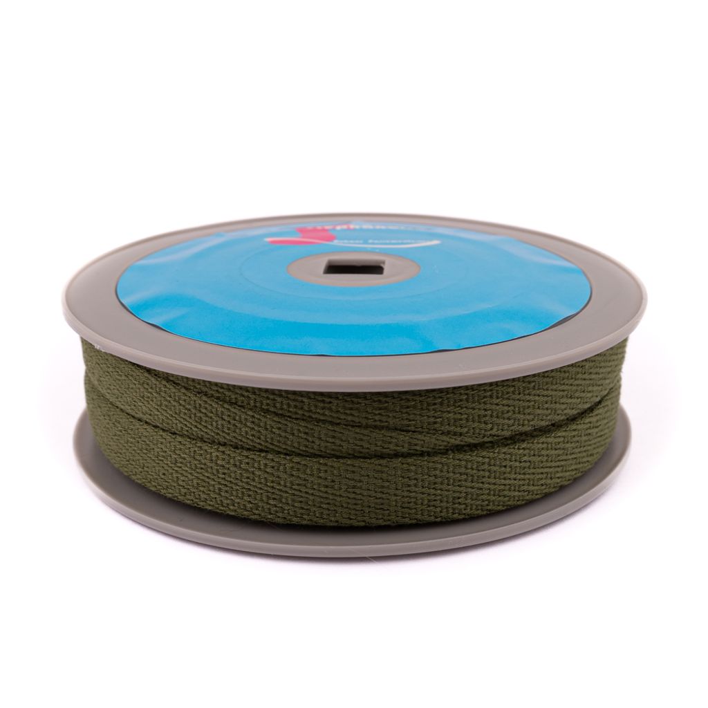 Slätt grönt möbelband i 100% polyester, 15mm bred, metervara för tapetsering med känsla av bomull.