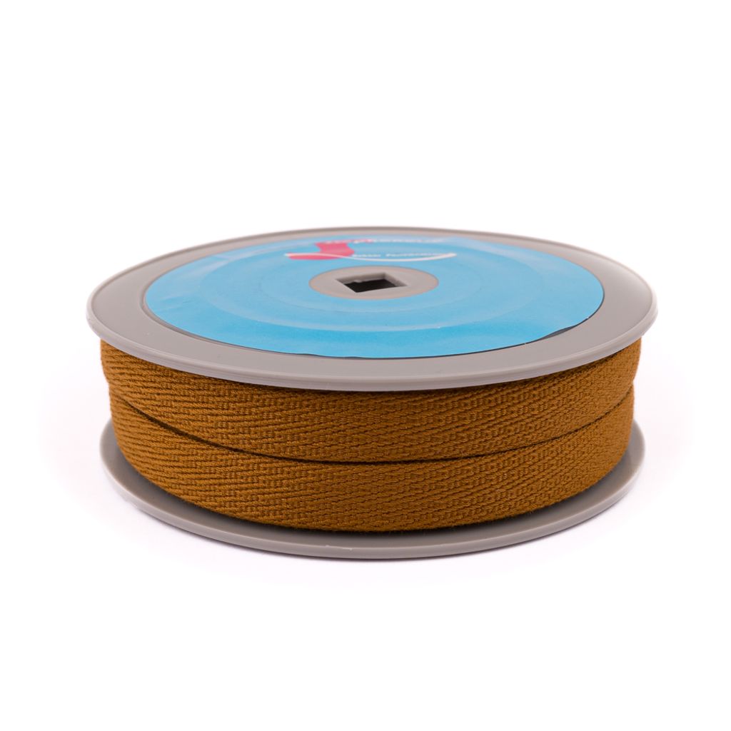 Slätt möbelband i ockra i 100% polyester, 15mm bred, metervara för tapetsering med känsla av bomull.