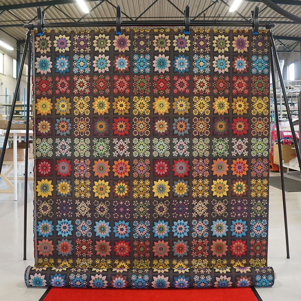 Mönstrat möbeltyg med mörkbrun botten blommor i härliga färger.