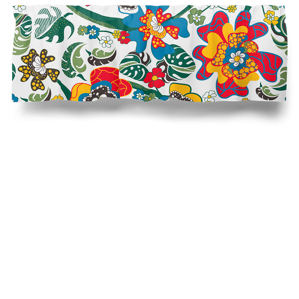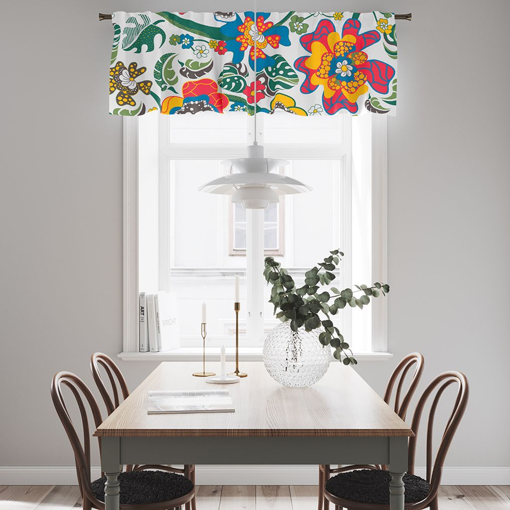 Förvandla ditt hem med vårt Monstera gardinkappa på metervara, en livfull och färgglad gardinkappa som fångar uppmärksamheten med sitt stora, lekfulla blomstermönster.