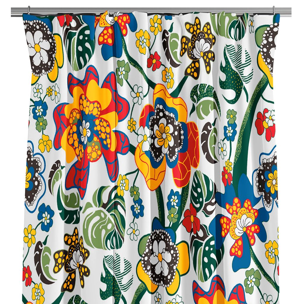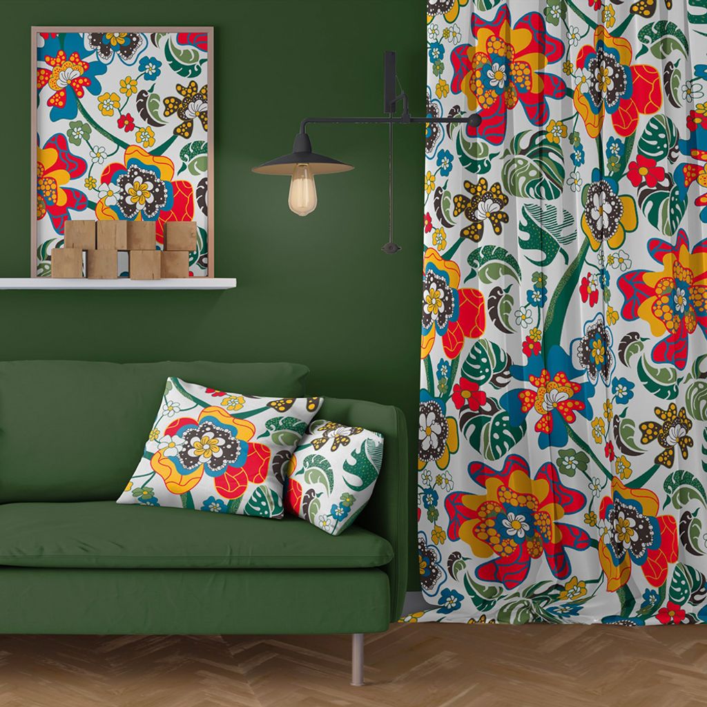 Beskrivning av Monstera multi gardiner – Färgstarkt blommönster med retro känsla