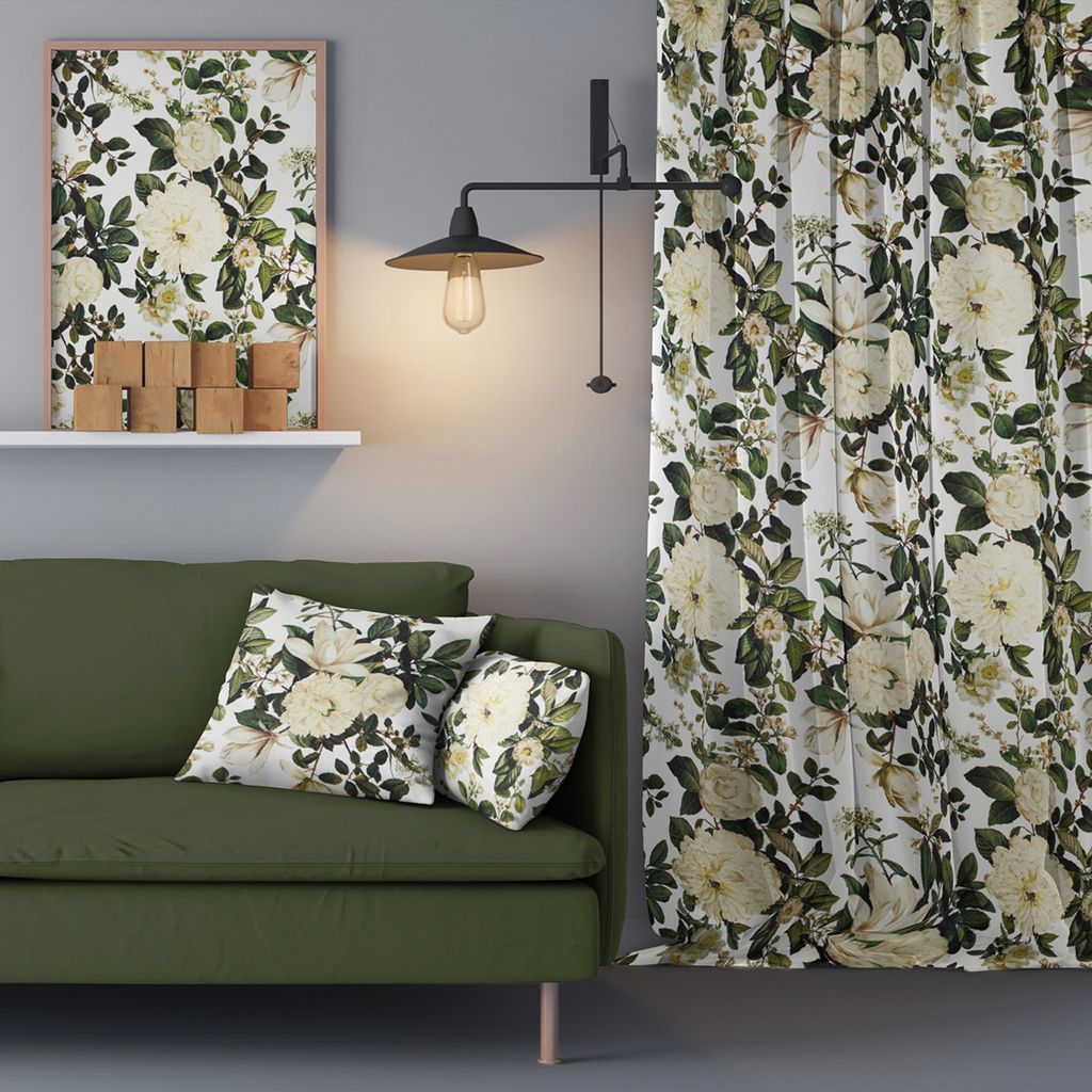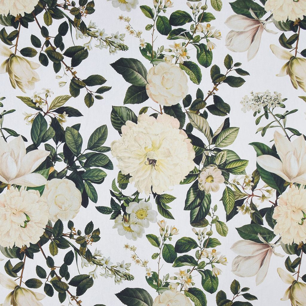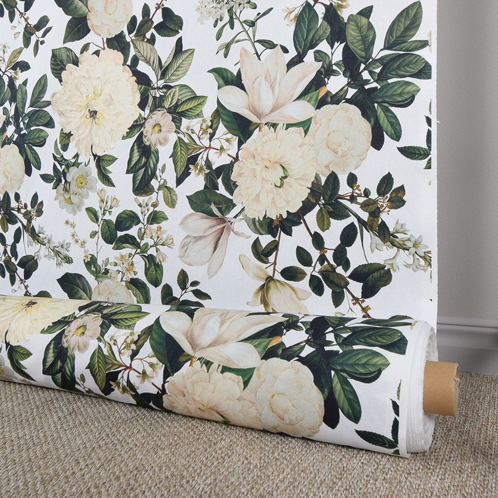 Snyggt tyg med mönster med stora vita blommor och gröna blad.