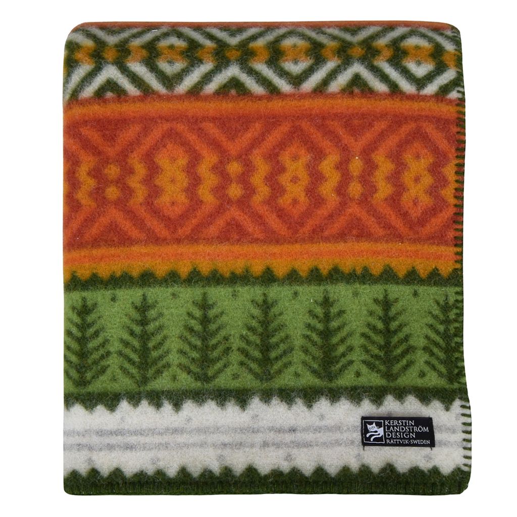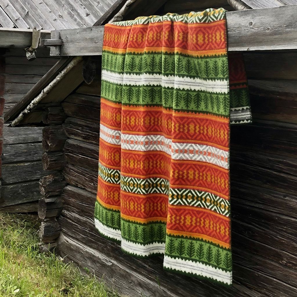 Vacker ullpläd med mönster inspirerat av Mora-dräkten och vävar som används till fälltäcken, draperier och andra textiler i Mora. Bårderna med granar och skidspår symboliserar Vasaloppet.