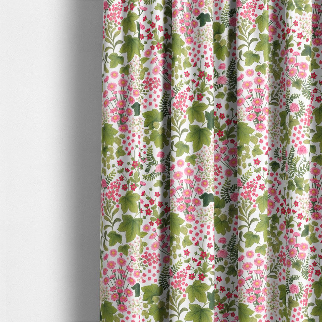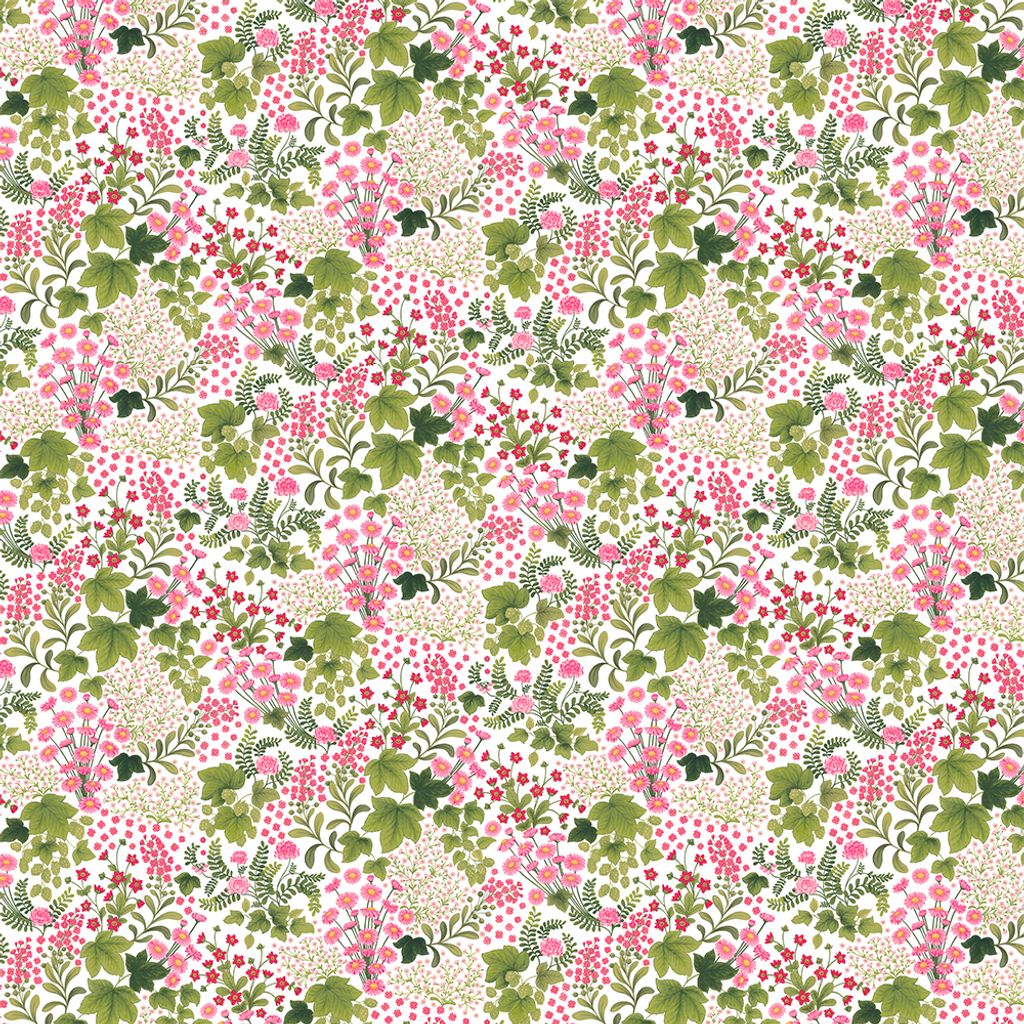 Mormors Täppa är ett ljuvligt tyg som fångar känslan av en blomstrande sommaräng i full prakt. Med sitt detaljerade mönster av prästkragar, klöver, humle, stjärnflocka och andra trädgårdsfavoriter i nyanser av rosa, rött och grönt, förmedlar tyget en nostalgisk, nästan sagolik stämning – som om det vore hämtat direkt från en lantlig torparträdgård.