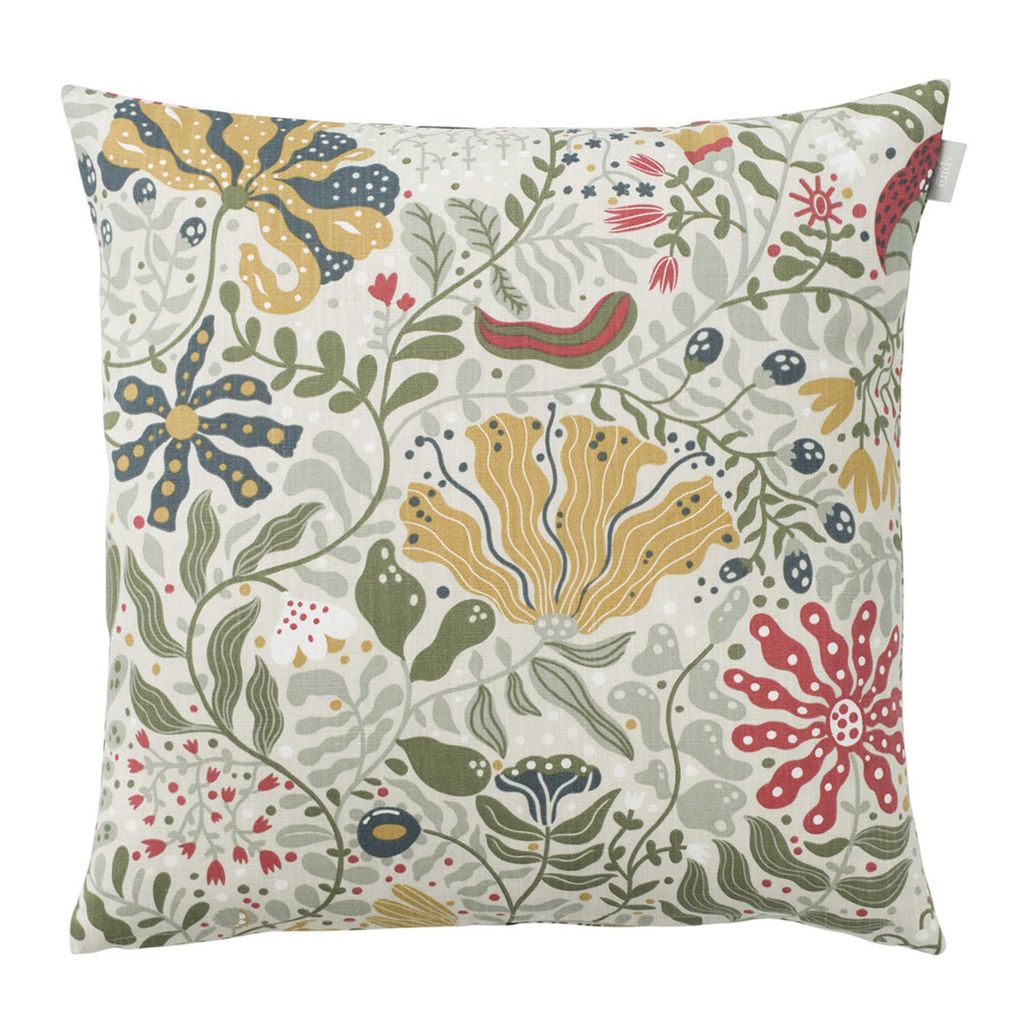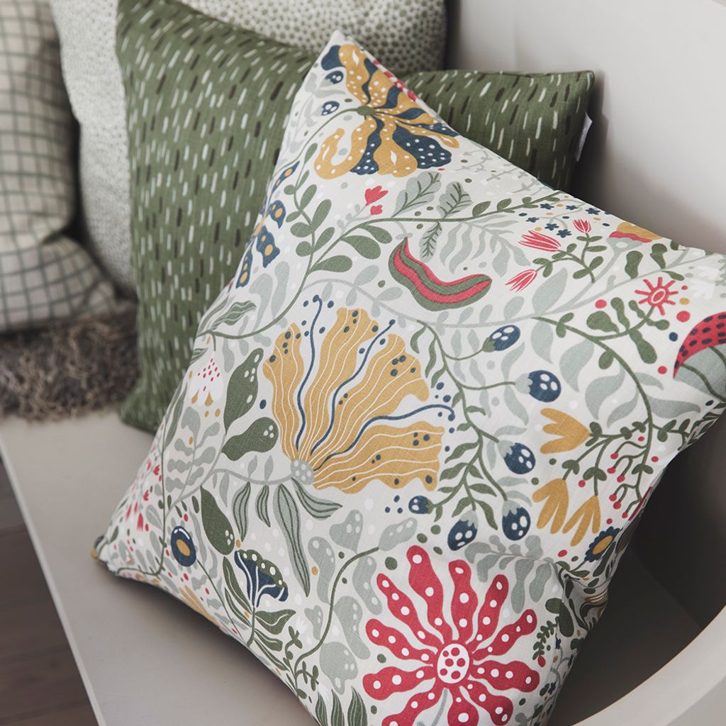 Kuddfodralet Myllra grön är inspirerat av brokiga jordgubbsodlingar och tiden mellan när allt står i full blom och då växterna ger efter och släpper sina fröer med vinden.