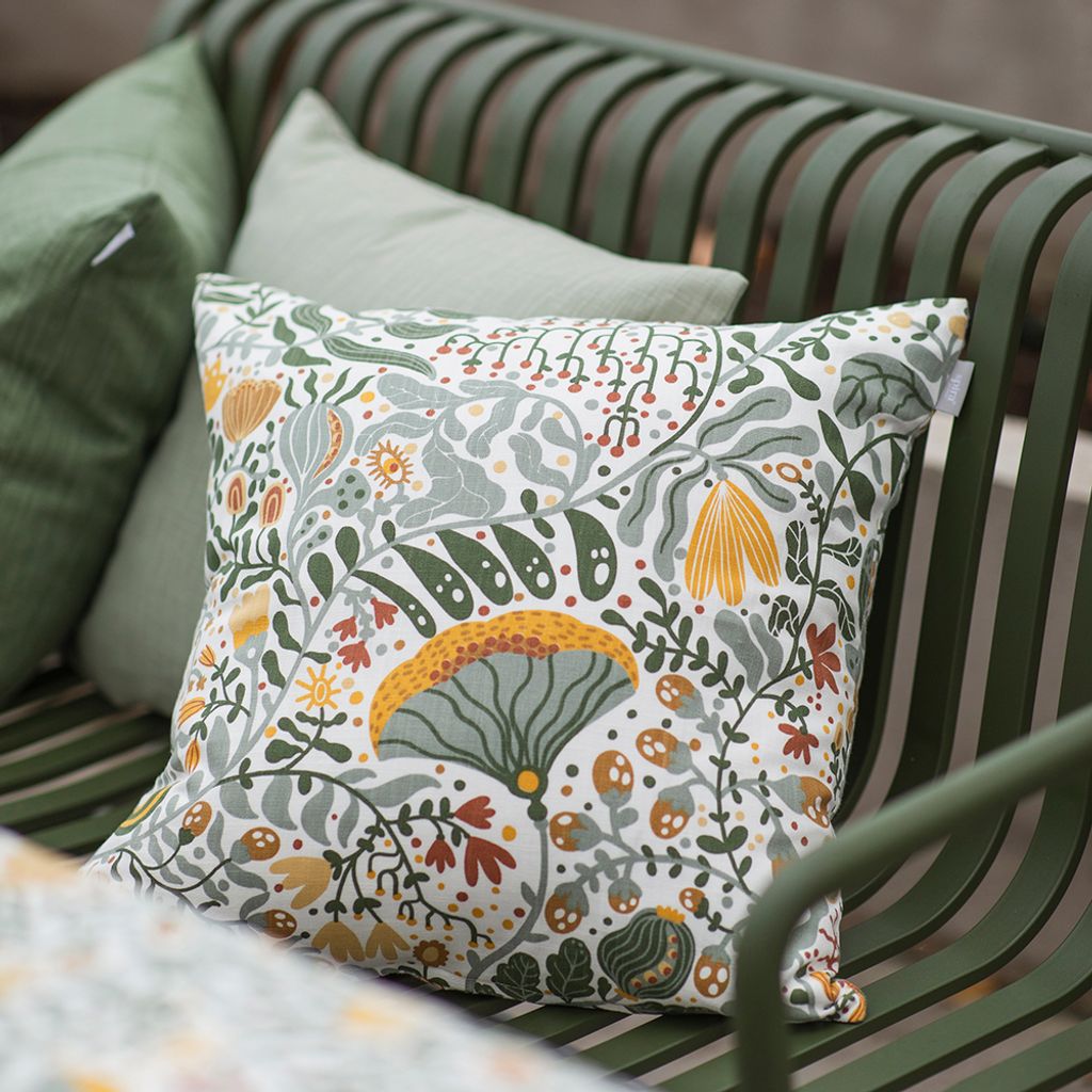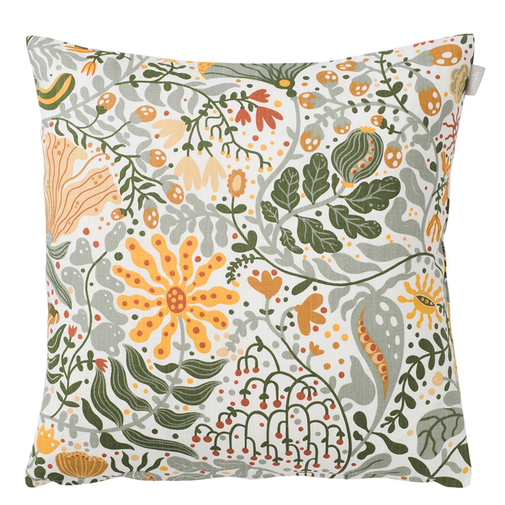 Ge ditt hem nytt liv med Myllra gul – ett kuddfodral fyllt av färg, energi och naturens egna former. Mönstret är en myllrande blandning av blommor, blad, frökapslar och knoppar, tecknade i ett stiliserat, lekfullt uttryck som hämtar inspiration från skandinaviska ängar och växtlighet. Den naturnära färgskalan i solgult, olivgrönt, dämpad roströd och varm gråbeige gör kudden lätt att kombinera med både jordnära och ljusa toner.