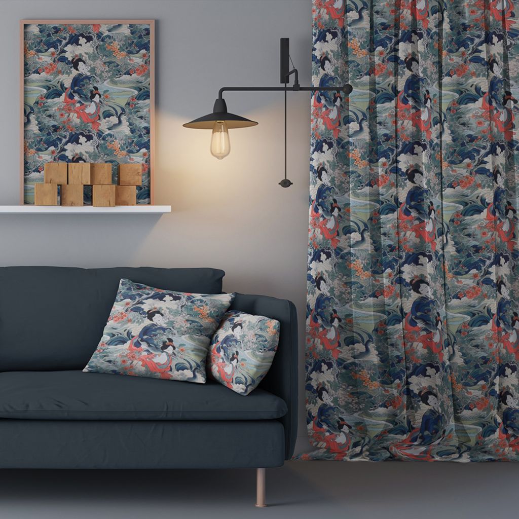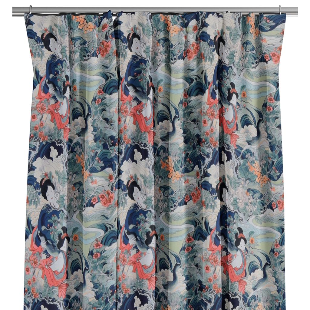 Magiska gardiner med mönster av geishor, blommor, landskap och fåglar. Digitaltryckt på ett vitt tyg så baksidan är vit.