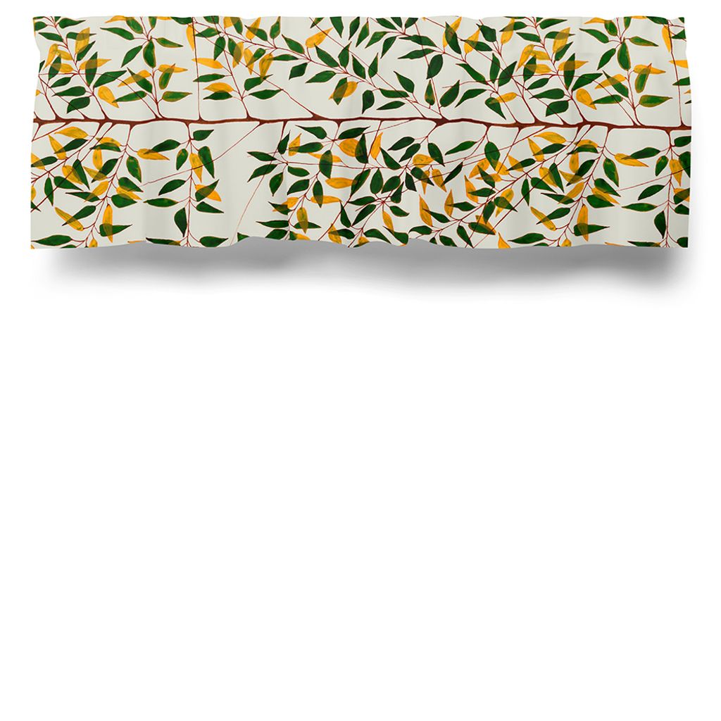 En gardinkappa med ett underbart mönster med grenar i grönt och orange