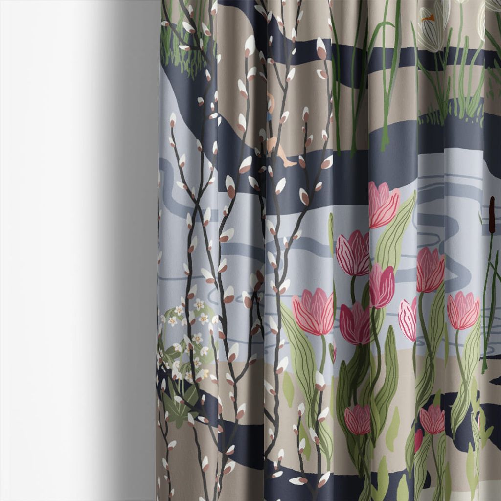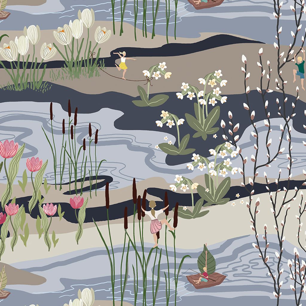 Ett vackert motiv med naturens vackra rosa och vita blommor, vatten och växter i blått och beige. Mönstret är tryckt på en fin bomullsvara.