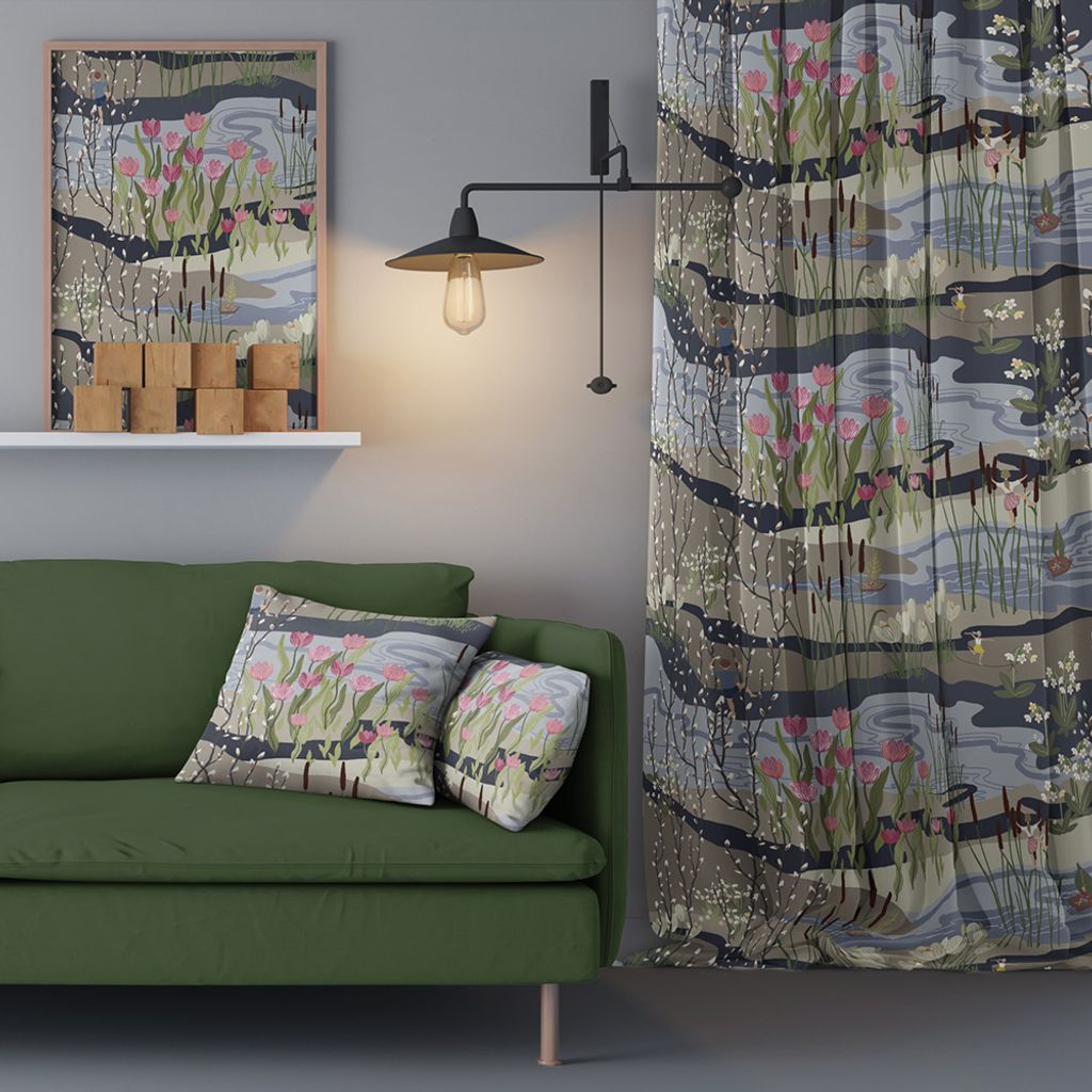 Tyget Naturens lycka blå gör sig bra till gardiner, kuddar, duk, väskor m.m.