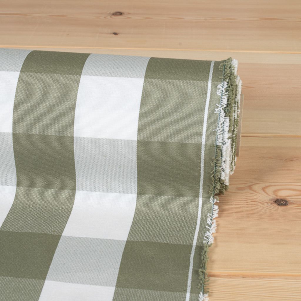 Rutigt tyg i offwhite och grönt som passar både till gardin och möbler.