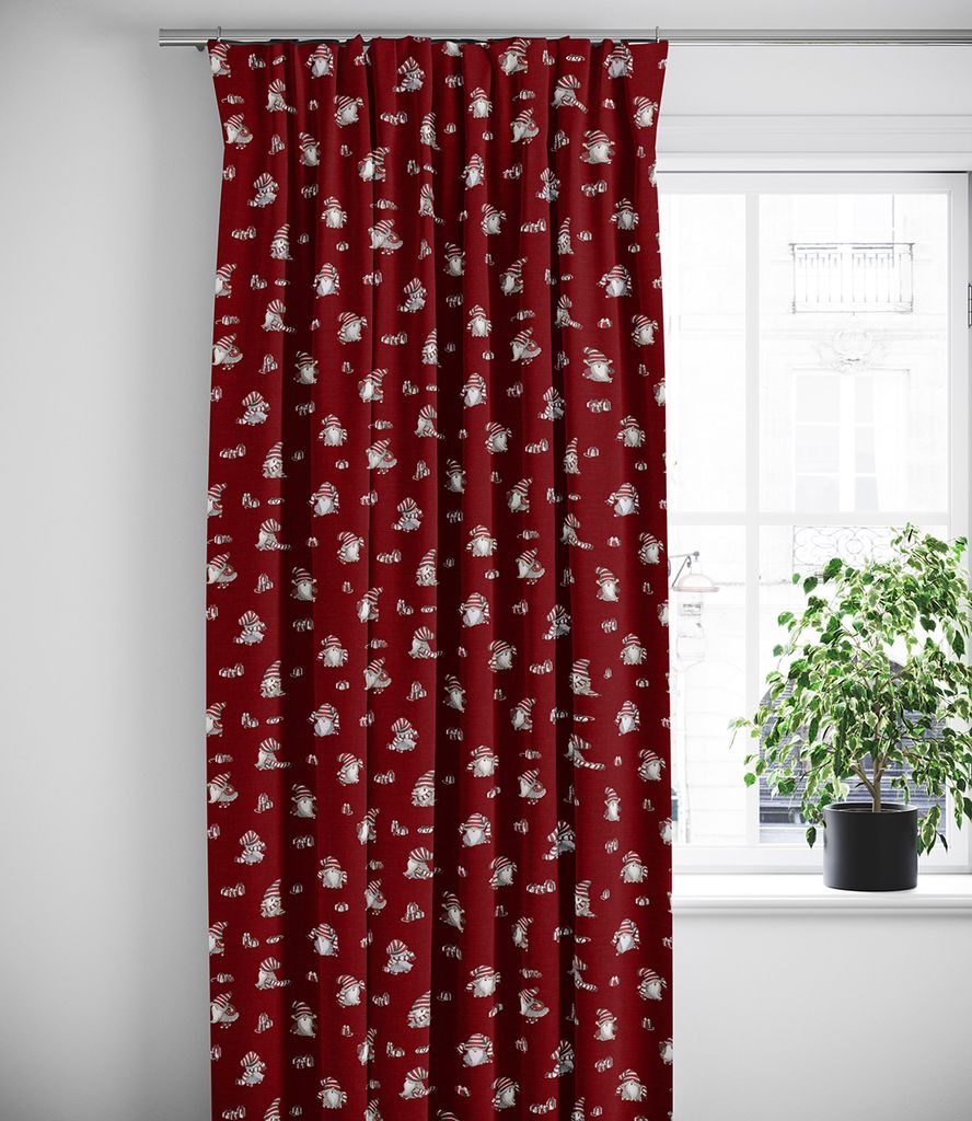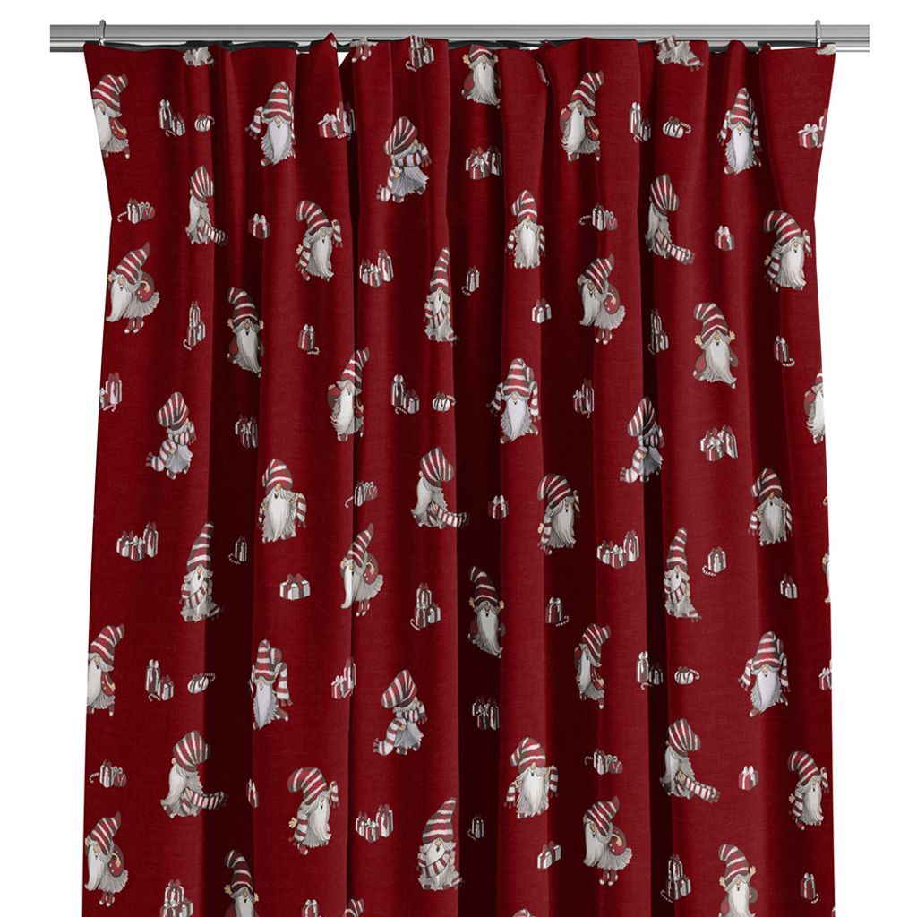 Söta vinröda julgardiner med tomtar, nisses luva och paket