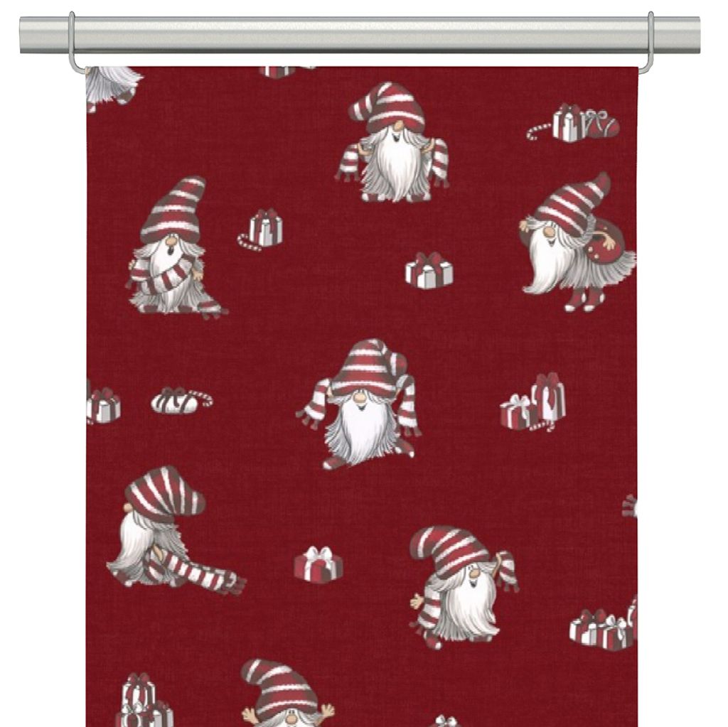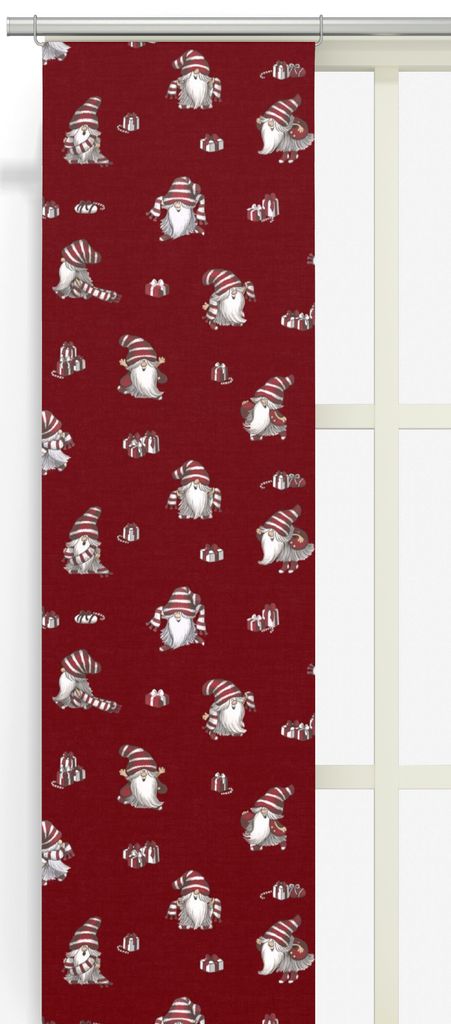 Röda panelgardiner med söta tomtar och dess luva från Arvidssons textil. Ofållad nederkant med overlocksöm.