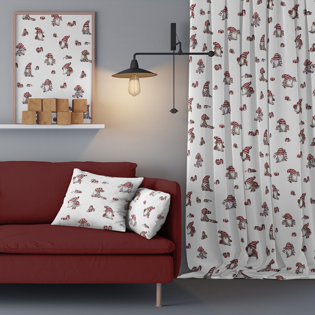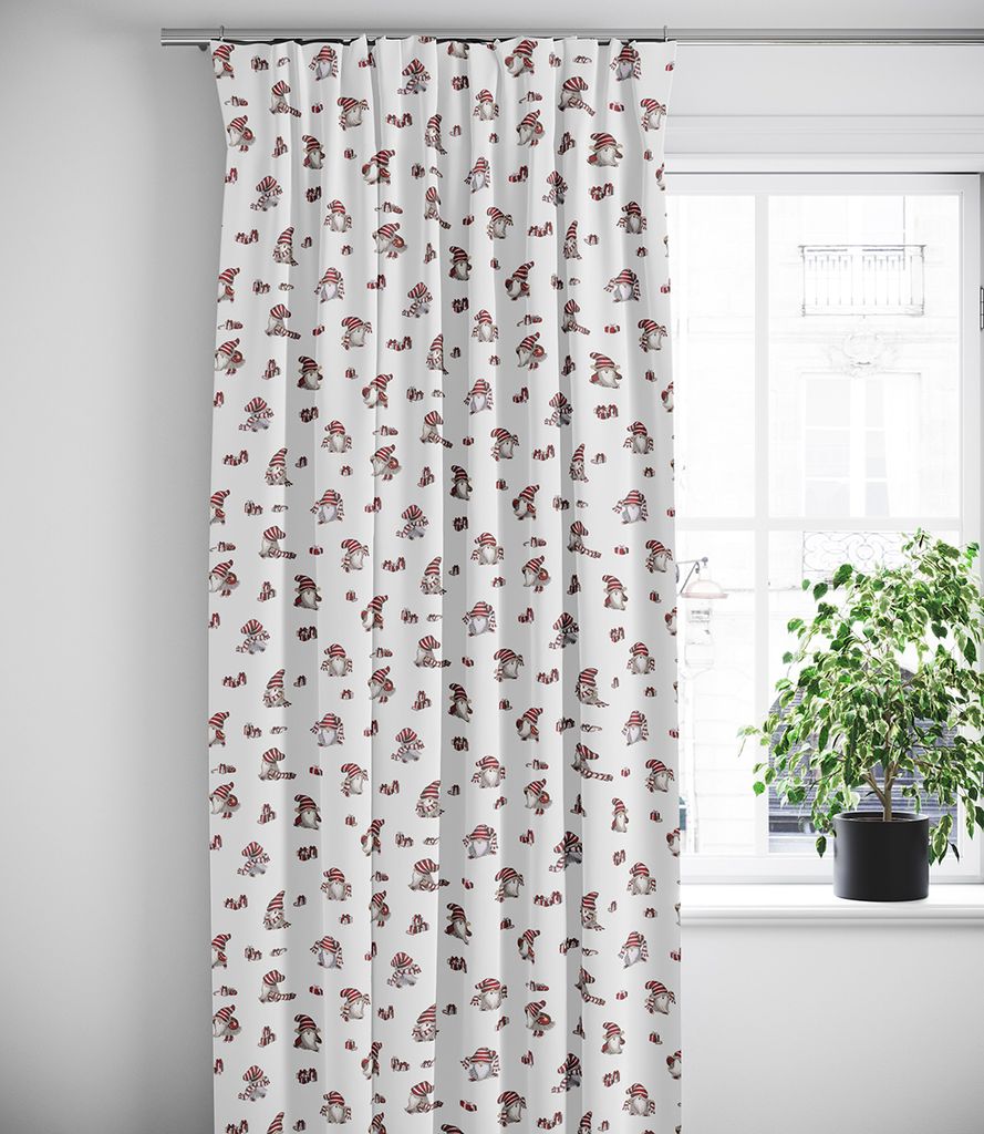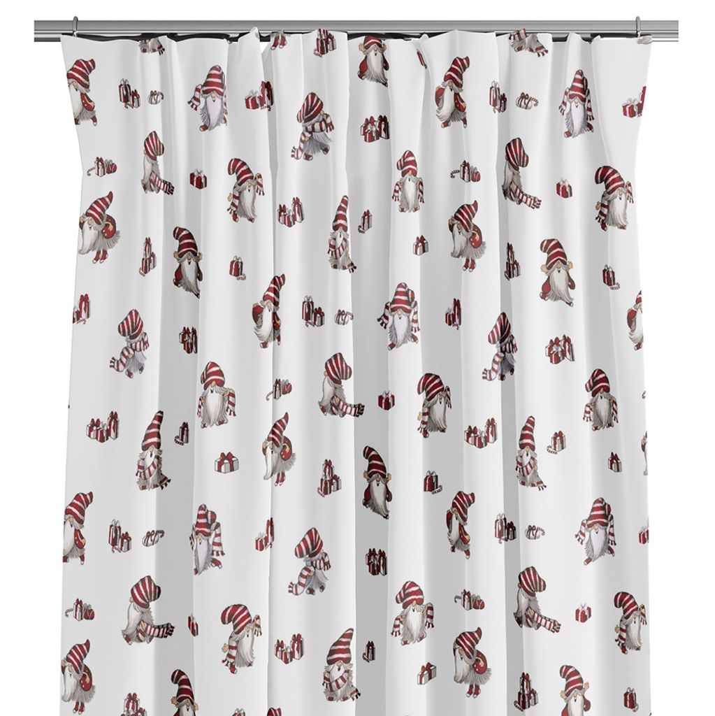 Söta vita julgardiner med tomtar, nisses luva och paket i rött