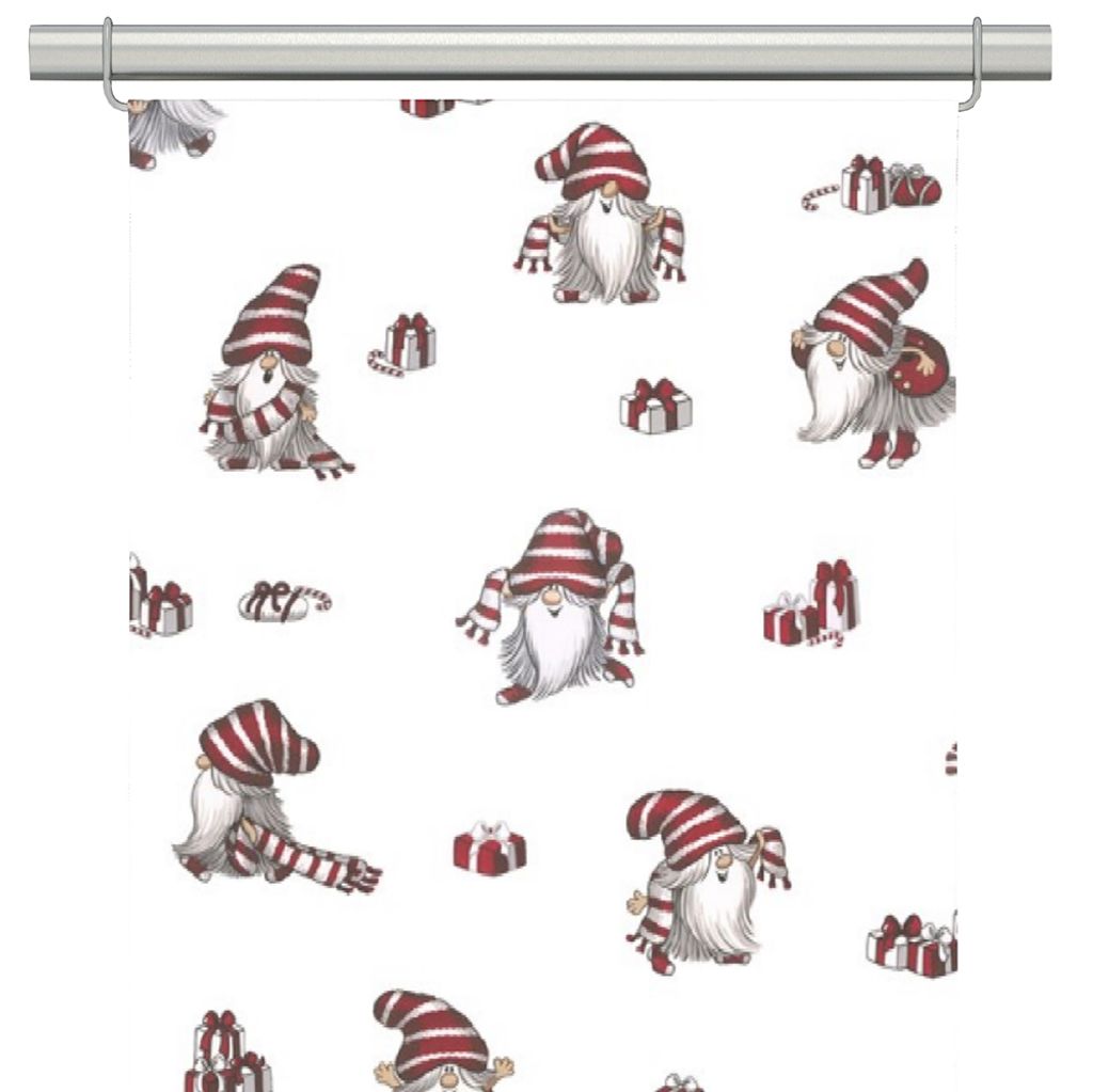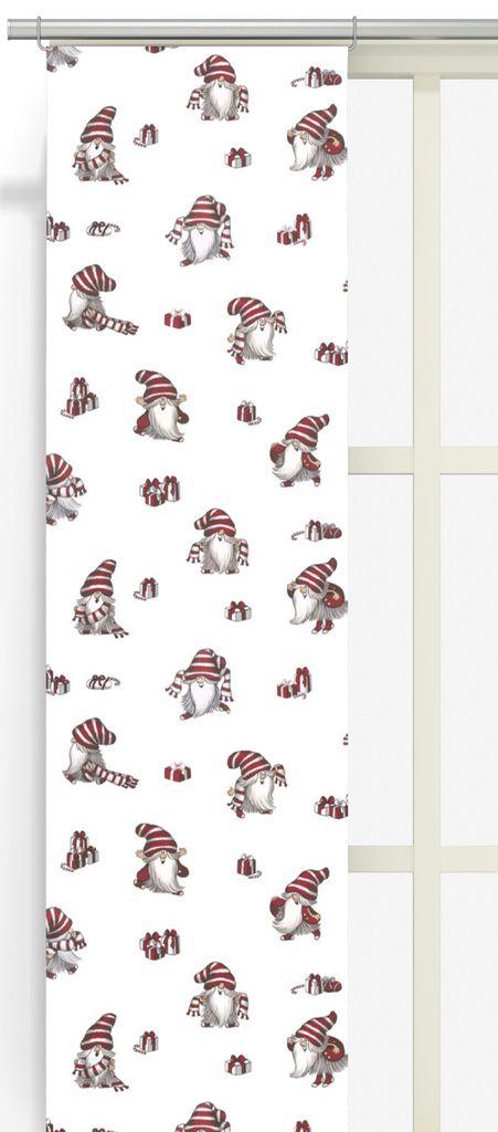 Vita panelgardiner med söta tomtar och dess luva från Arvidssons textil. Ofållad nederkant med overlocksöm.