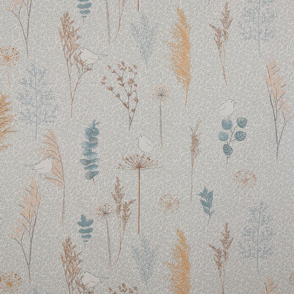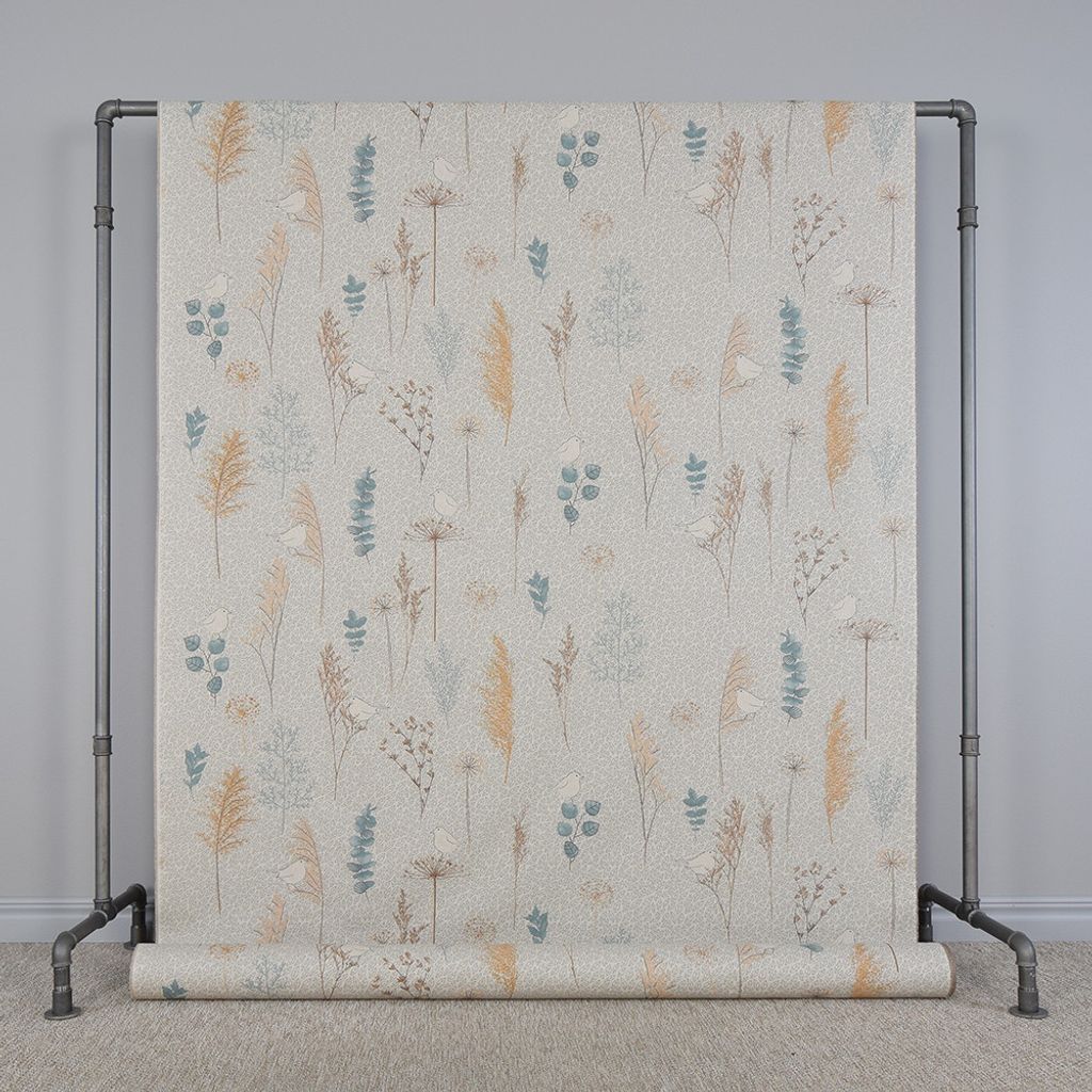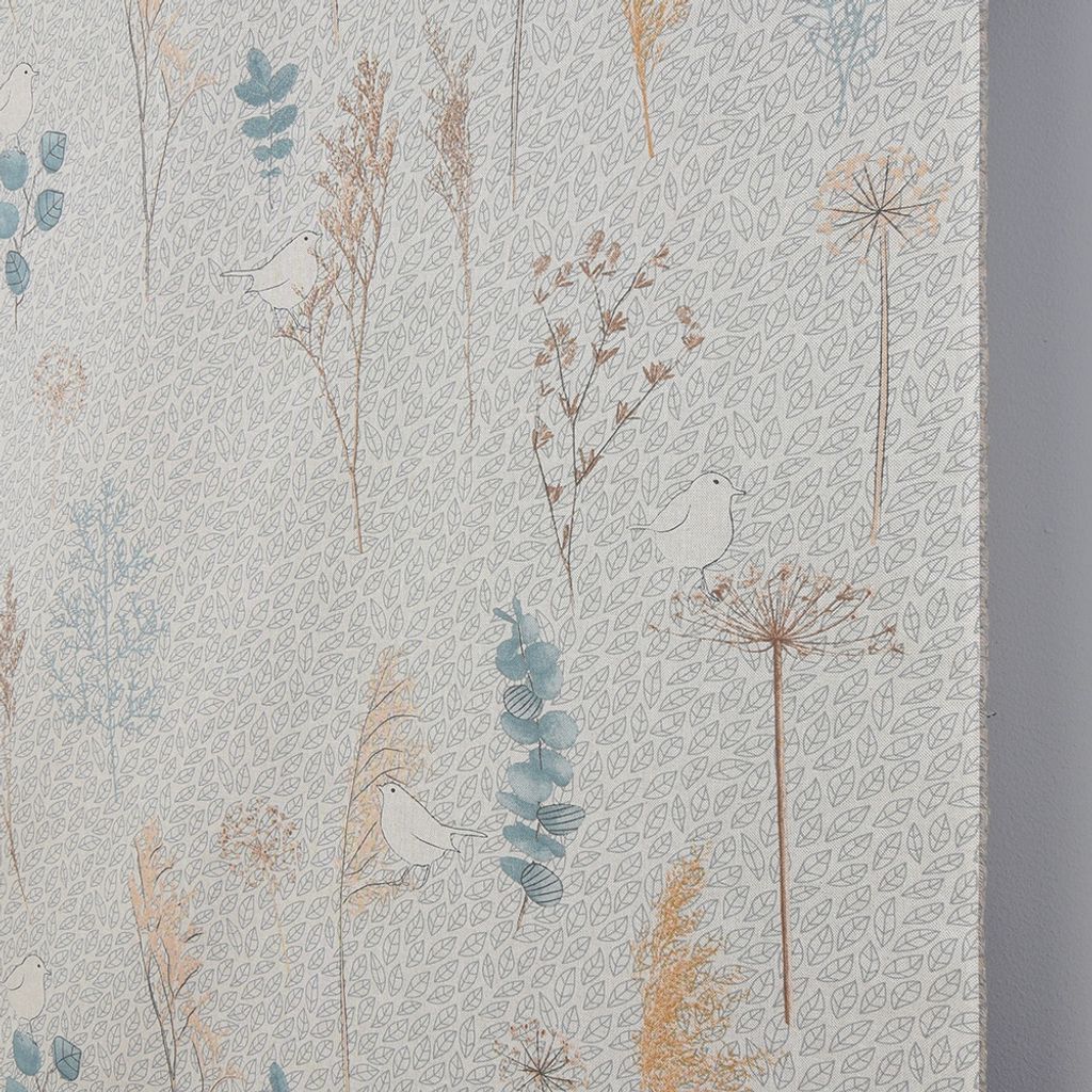 Tyg för gardiner och inredning med ett vacker mönster med kvistar, blad och fåglar på linne färgad botten.