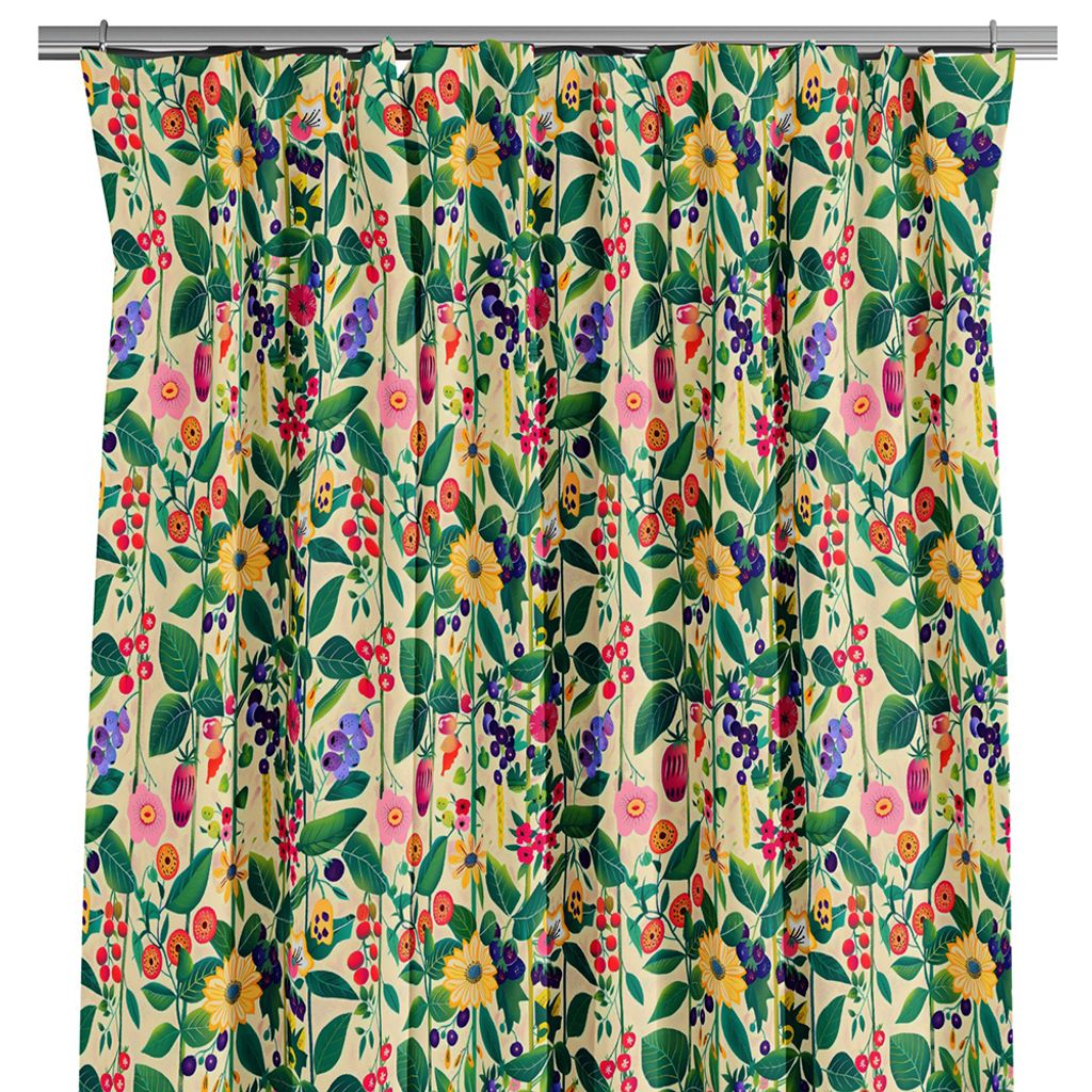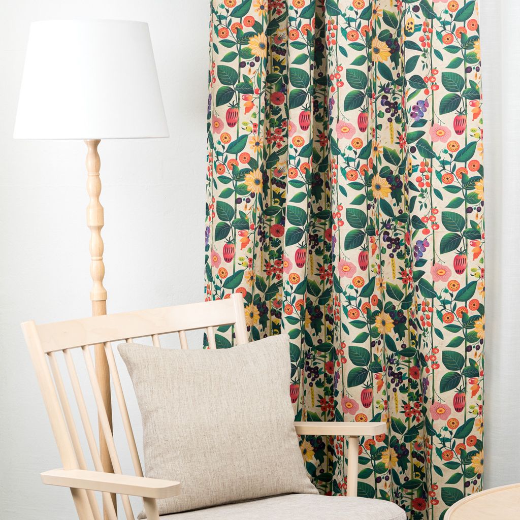 Låt naturen flytta in med Nordisk Flora gardiner, färgstark och livlig design inspirerad av skandinavisk växtlighet. De frodiga blommorna och bären i mustiga färger skapar en varm och inbjudande känsla i hemmet. Perfekta för dig som vill addera en touch av natur och livfullhet till ditt hem. Ouppfållade med overlocksöm nedtill.