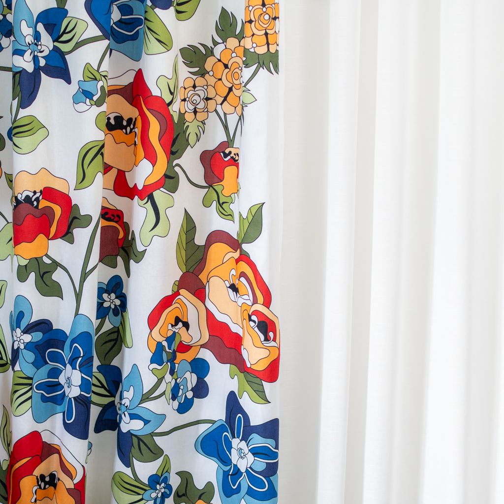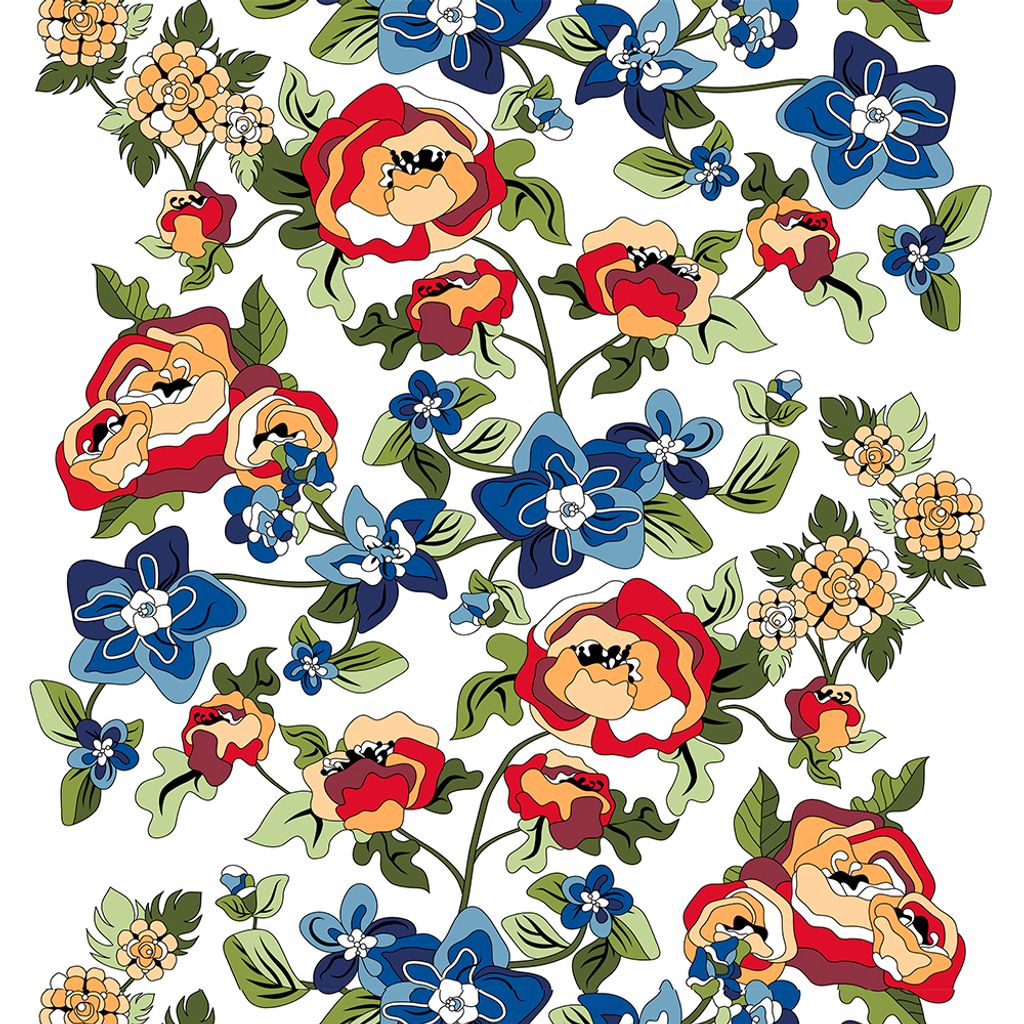 Vi har tillsammans med Shalmiak tagit fram och tryckt detta underbara storblommiga mönster. Mönster går över hela tyget och har en färgställning i rött, blått, grönt, orange och gult.
